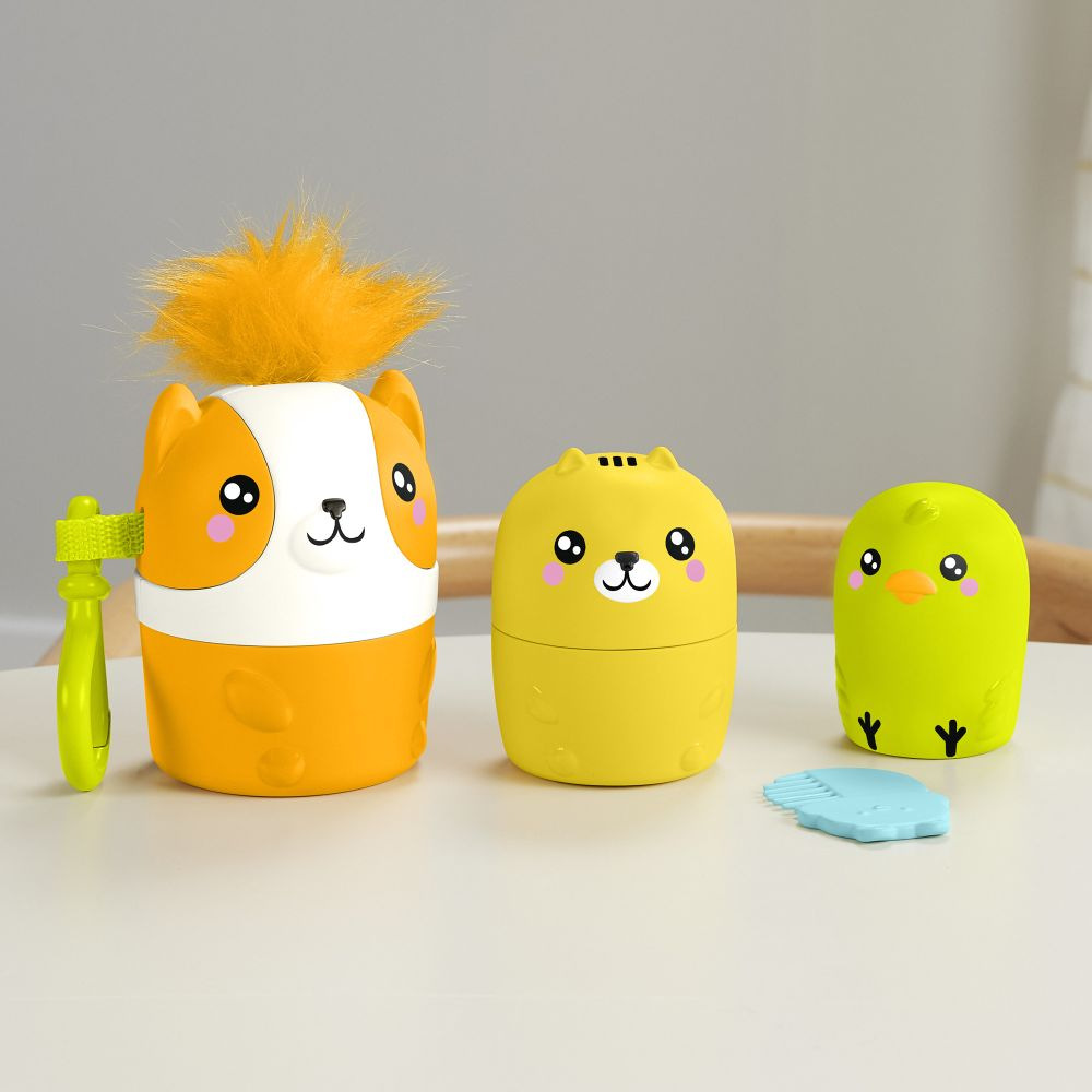 Rodiče dětí v předškolním věku si zamilují péči o tato rozkošná hnízdící zvířátka od Fisher-Price®! Tato hračka obsahuje od velkého po malého korgiho, kočku, ptáčka a křečka. Tři větší zvířátka mají různé uzávěry, zatímco křeček funguje jako hřeben, kterým může dítě "česat" srst corgiho, což pomáhá posilovat jeho zručnost.