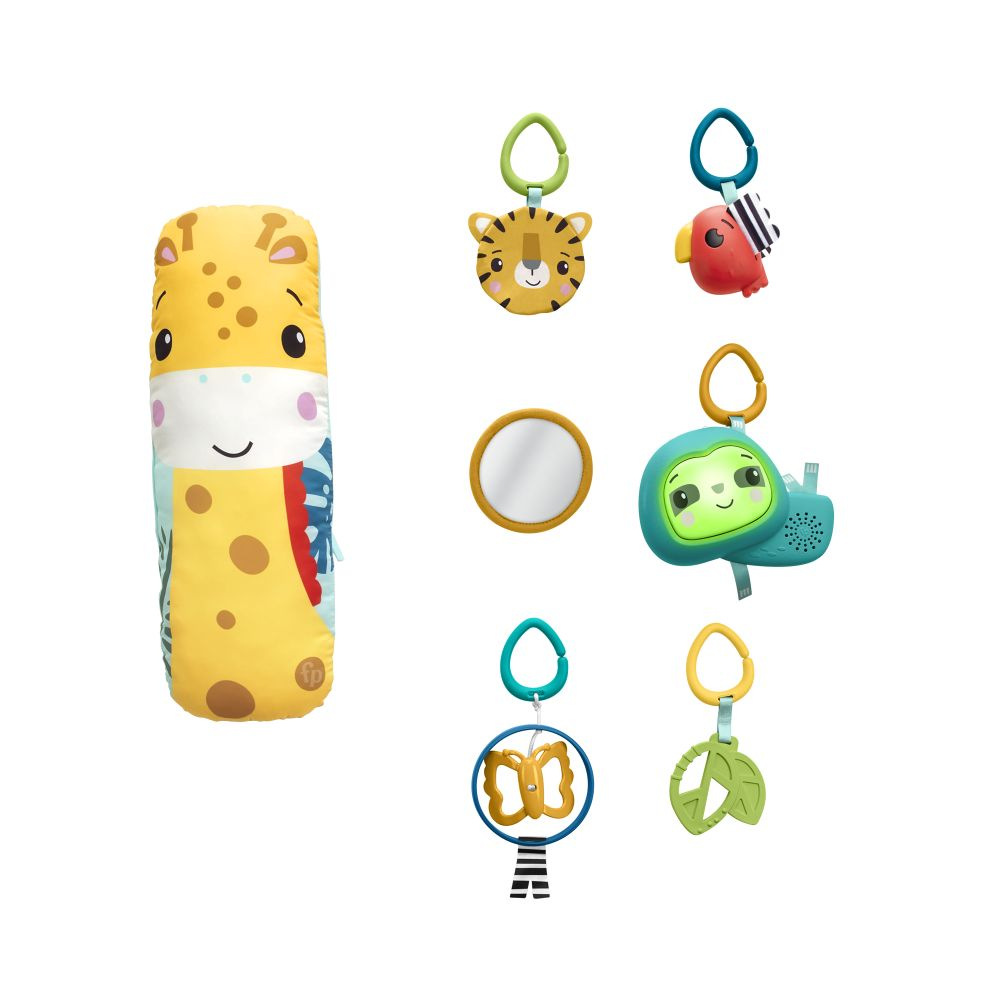 Fisher-Price® Hrací dečka se žirafou 3 v 1 roste spolu s vaším děťátkem od novorozence až po batole. Novorozenci mohou ležet na měkké hrací podložce a nad nimi je na obloucích zavěšeno 6 hraček, které stimulují jejich smysly. Při hře na bříšku lze nastavitelný oblouk posunout dolů, aby byly hračky v dosahu, zatímco polštářek ve tvaru žirafy pomáhá dítě při hře podpírat. Hračka lenochoda s hudbou a světly navíc zajistí, že hraní bude stále zábavné.