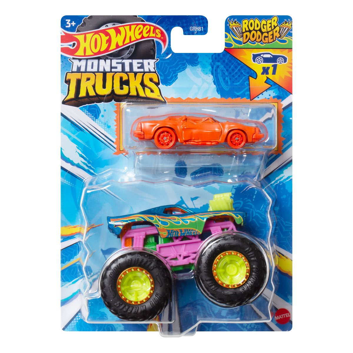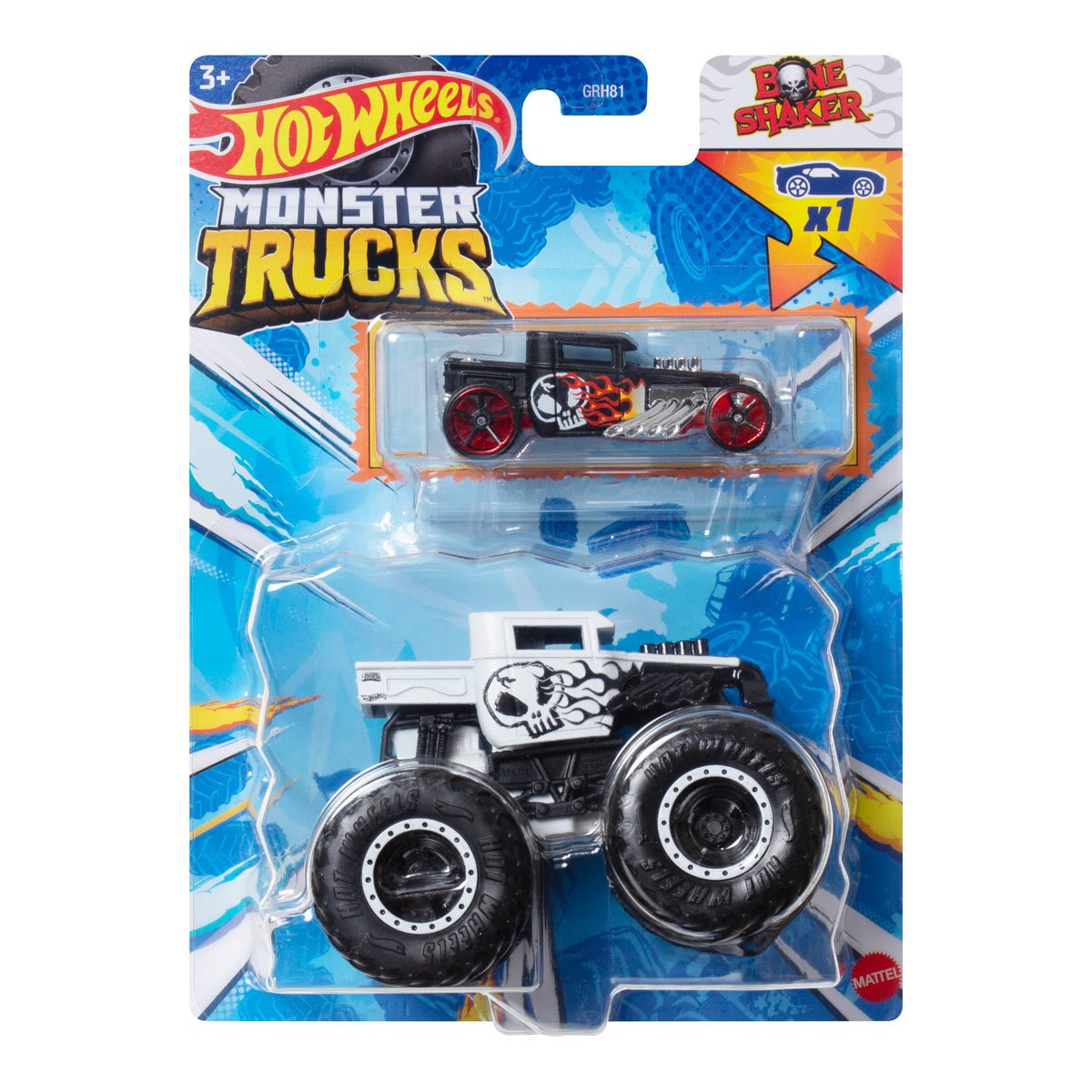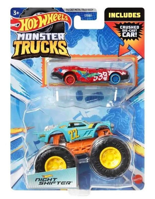 Hot Wheels® Monster Trucks v měřítku 1:64 jsou tlakově lité vozy nejhoršími kamiony, jaké kdy byly vyrobeny pro konkurenci a konečnou dominanci! Každé z těchto 2 balíčků Hot Wheels® Monster Trucks je dodáváno s odlitým autem Hot Wheels® v odpovídajícím dekóru, takže oba mohou čelit mnoha havarijním akcím. Balíček poskytuje statistiky pro každého, včetně jména, typu nákladního vozidla, síly, jedinečného útoku při havárii a motorizace pro skvělou zábavu při vyprávění. Děti je mohou sbírat, aby je rozbily, havarovaly a umocnily v přímých bitvách pomocí svých obřích kol! Každý se prodává samostatně, v závislosti na dostupnosti. Barvy a dekorace se mohou lišit.