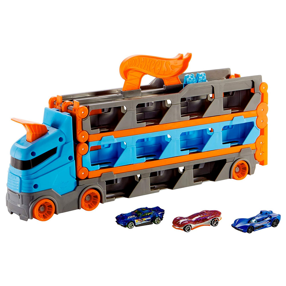 Závodní tahač Hot Wheels® Speedway Hauler ™ předefinuje skladování a závody Hot Wheels® jedním skvělým kamionem plným překvapení. Malé výlohy na návěsu vystavují více než 20 aut Hot Wheels®, která unese, a když děti zatáhnou za zadní západku, tahač se rozloží na šest stop dlouhou závodní dráhu! Nepoužitá auta zůstávají viditelná pod tratí, zatímco kabina nákladního vozu se přemění na duální odpalovač, který vysílá dvě soupeřící auta do impozantního souboje. Vítěz pokračuje do dalšího dobrodružství dráhami, které se propojují s dalšími sety Hot Wheels ™ City (prodávanými samostatně). Multifunkční vozidlo je dodáváno se třemi vozidly Hot Wheels® v měřítku 1:64 a pojme dalších 20 (prodává se samostatně). Poskytuje nekonečnou zábavu dětem ve věku od 4 do 8 let. Barvy a dekorace se mohou lišit.