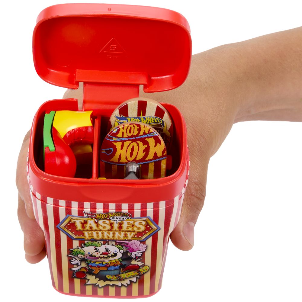 Vezměte si prkna na cesty s krabičkou Hot Wheels®, která pojme a ukryje 2 plně sestavené fingerboardy a pár skate a která připomíná balení žvýkaček! Otevřete "příchuť" jako "Bubble Blast" nebo "Snakeberry Sour", každá krabička je zdobená stylovou grafikou. Uvnitř jsou 2 exkluzivní prkna a pár odnímatelných skate bot s odpovídající kresbou a barvami. Každé balení se prodává samostatně dle aktuální nabídky.