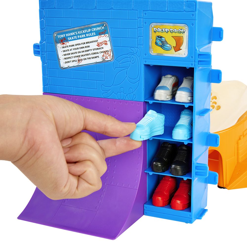S herním setem Hot Wheels® Cereáliový fingerboard skatepark se můžete prohánět po velkolepé misce s cereáliemi. Tento skate set s motivem cereálií, vytvořený ve spolupráci s legendou skateboardingu Tony Hawkem, vyzývá fingerboardisty, aby projeli miskou s cereáliemi, předváděli vertikální triky na krabici s cereáliemi a nahoře zabrousili na zábradlí, aby mohli odhalit překvapivou trofej. Projeďte se po zadní rampě a zabruste na rail na lžíci, abyste měli větší šmrnc! Součástí je jeden exkluzivní fingerboard a odnímatelný pár skate bot s úložným prostorem pro čtyři prkna a čtyři páry bot. (Další prkna a boty se prodávají samostatně.) Barvy a provedení se mohou lišit.