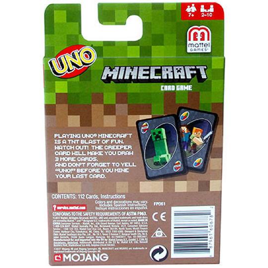 Stejně jako ve hře UNO ™, kterou máte rádi, účastní se hry UNO ™ Minecraft hráči snažící se co nejrychleji zbavit všech svých karet, ale tato verze obsahuje karty s postavami a obrázky Minecraftu a speciální pravidlo! Snažíte se přiřadit kartu ve své ruce k aktuální kartě, která je odkryta navrchu balíčku odložených karet a získáte body za karty, které vašim soupeřům zůstanou v držení. A v UNO ™ Minecraft existuje také nový typ akční karty když si vytáhnete kartu Creeper, ukažte ji ostatním hráčům a oni si budou muset nabrat další tři karty! První hráč, který dosáhne 500 bodů, vyhrává. Když už máte jen jednu kartu, nezapomeňte zakřičet „UNO!“ Obsahuje 112 karet plus pokyny. Pro 2 až 10 hráčů ve věku od 7 let. Snadné vytáhnout, nemožné odložit. Barvy a dekorace se mohou lišit.