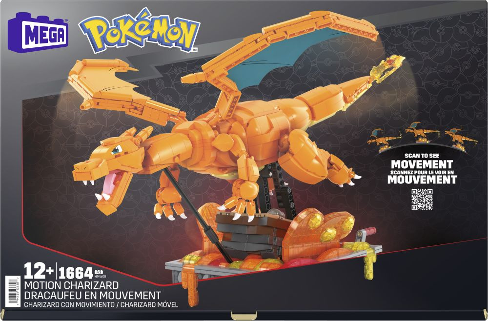 Pociťte žár s touto velmi detailně propracovanou a snadno pózovatelnou stavebnicí Charizard. Postavte model a otáčením kličky sledujte, jak se Charizard pohybuje sem a tam, jak se mu třepotají křídla a pohybuje láva. Do detailu propracovaná základna obsahuje vyměnitelné jmenovky v různých jazycích.