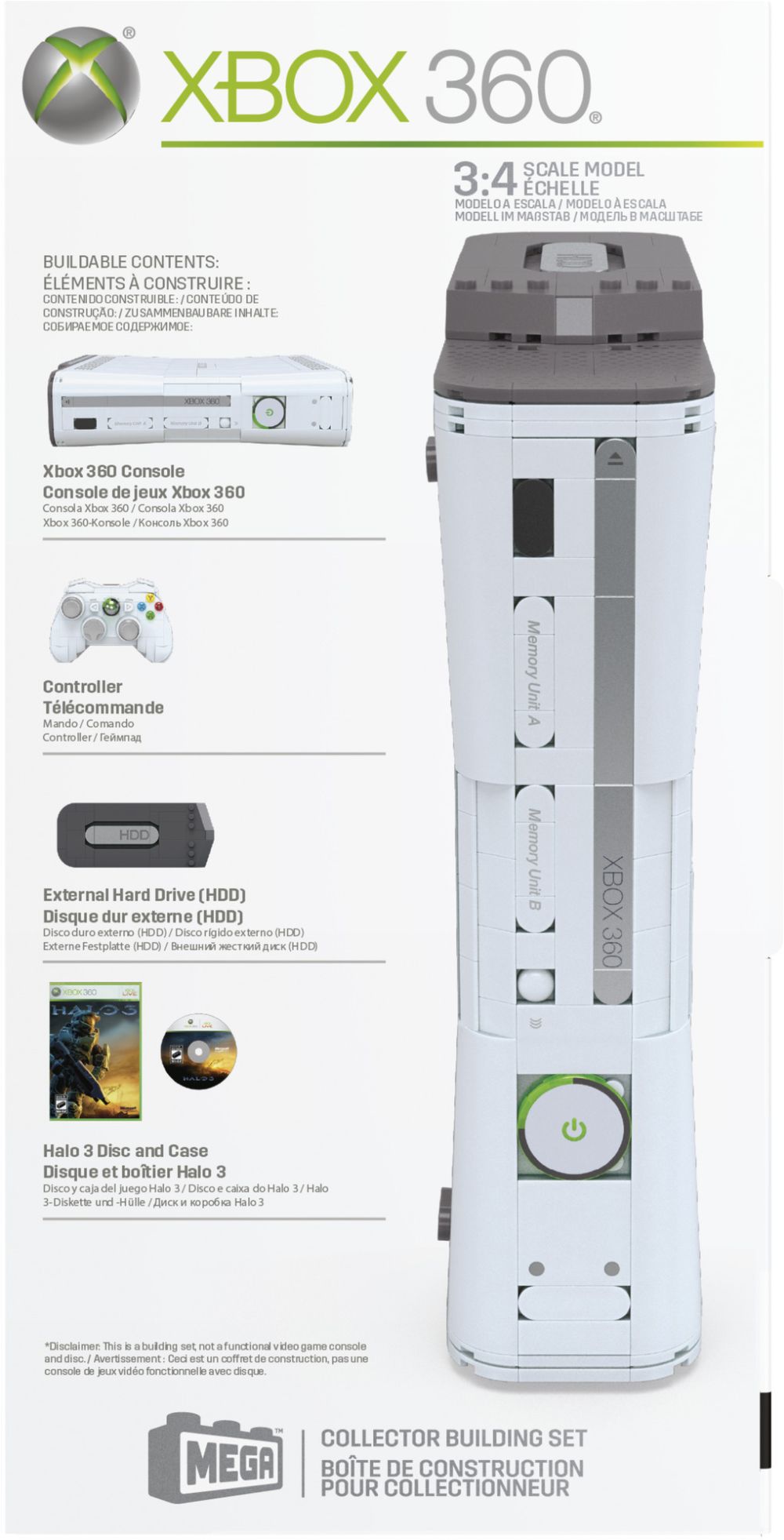 Tato sběratelská stavebnice MEGA je inspirována nejznámější herní konzolí své doby a oslavuje odkaz konzole Xbox 360. Vraťte se do hry s plně sestavitelnou, svítící konzolí a ovladačem. Konzole se otevře a odhalí diskovou mechaniku (a další tajné ukryté informace) vložte dovnitř disk s motivem Halo 3 a aktivujte základní desku.