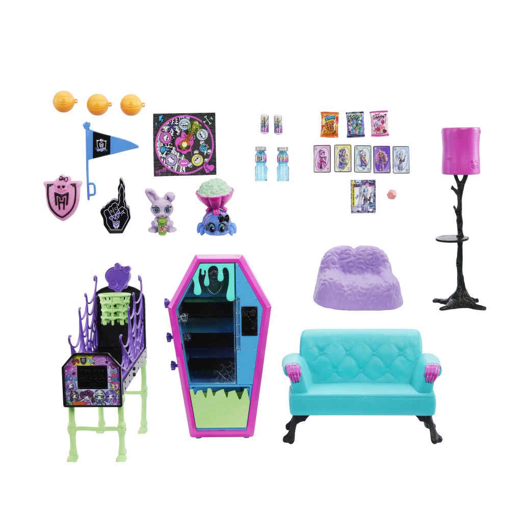 Když je učení ďábelsky těžké a příšerky z Monster High™ straší monstrózní množství úkolů, pak pro ně neexistuje lepší místo než Monster High™ Strašidelná studovna! A když už musí mladé dámy studovat, tak ať to mají se vším pohodlím! Dokonalá klubová pohovka a lampa, z níž by byl na větvi nejeden dyzajnér, zajistí místo na učení i odpočinkový relax. A když už jsou monsterky z učení na smrt unavené mohou si koupit super silné děspresso ve funkčním rakvomatu! Mazlíčci, vlaječky, erby a další drobnůstky skvěle dokreslují příšeržasnou atmosféru! Panenky nejsou součástí balení. Barvy a provedení se mohou lišit.