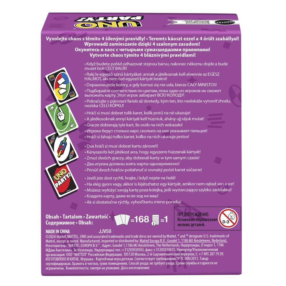 Speciální edice oblíbené karetní hry UNO, která se hraje stejně jako klasické UNO® – hledáte karty se stejnou barvou, číslem nebo symbolem. Tato verze je upravena pro větší skupiny hráčů, obsahuje více karet a přináší ještě hlasitější, bláznivější a divočejší zábavu. Nezapomeňte vykřiknout „UNO!“, když vám zbývá poslední karta. Přidává i nová pravidla pro interaktivní hru, například kartu „Ukaž na druhého“, kdy musí každý hráč ukázat na jiného – a ten si lízne kartu. UNO Party obsahuje 168 karet, což odpovídá 1,5 balíčku klasického UNO, a je ideální na každou párty nebo rodinné setkání plné smíchu.