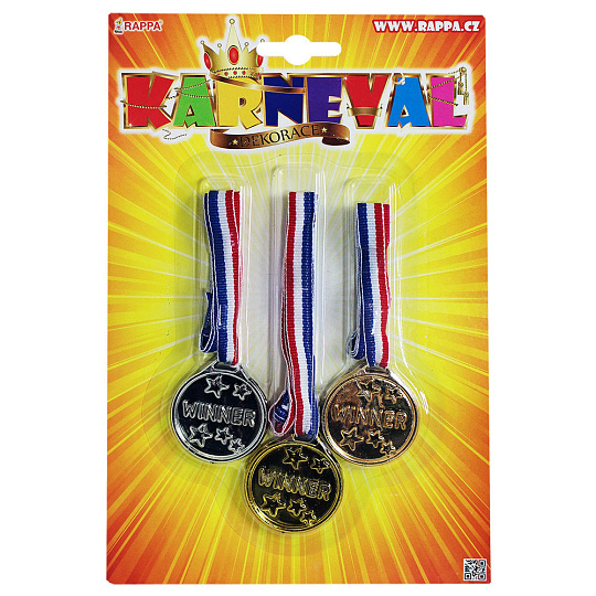 Oceň své kamarády opravdovými medailemi! Balení obsahuje 3 ks medailí na šňůrce. Zlatou, stříbrnou a bronzovou. Medaile jsou vyrobeny z PVC. Fandíme na mistrovství!