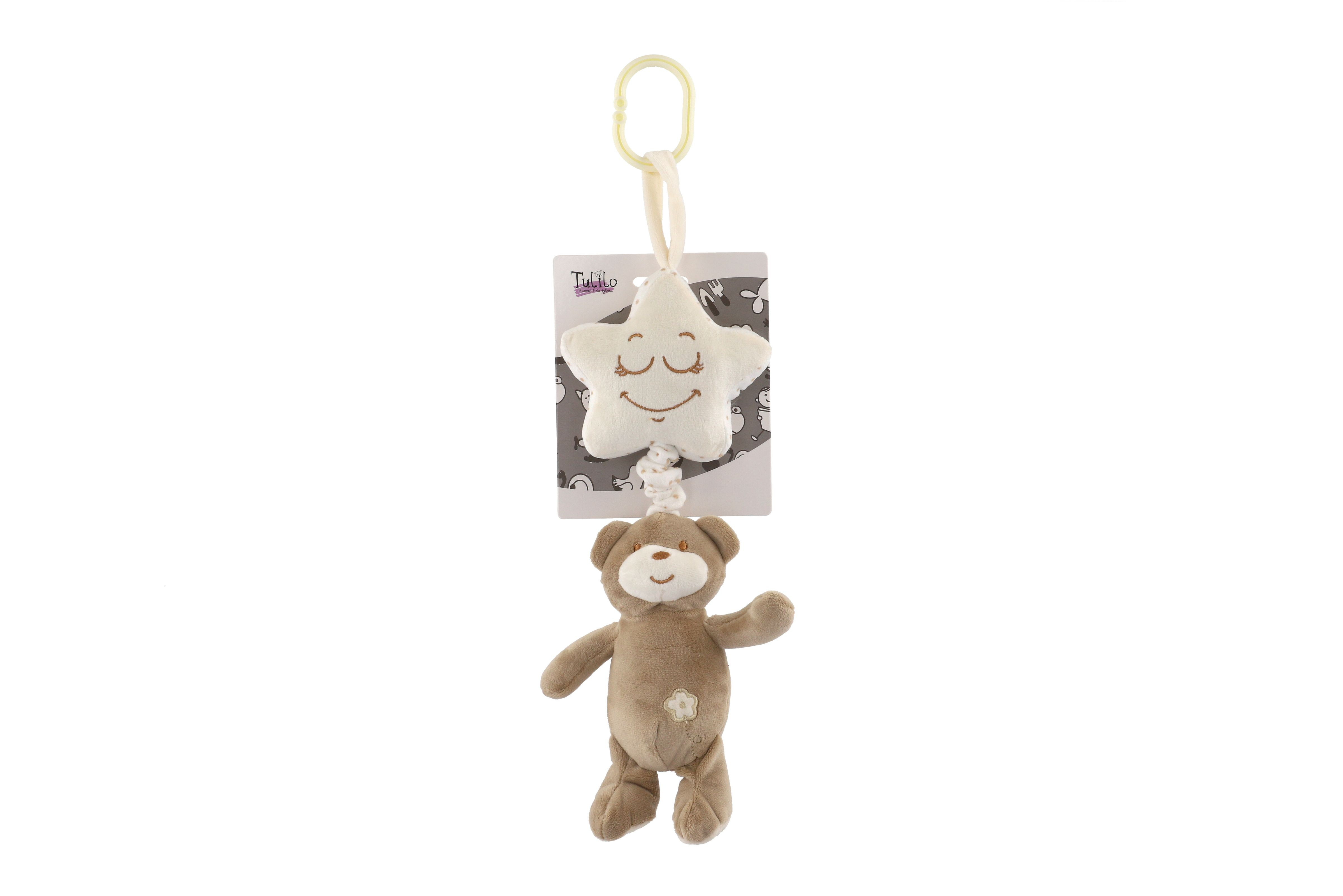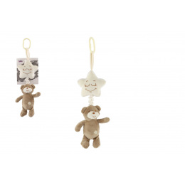 Medvěd s hvězdou plyš závěs na postýlku/kočárek natahovací hrací strojek 36cm na kartě v sáčku 0+