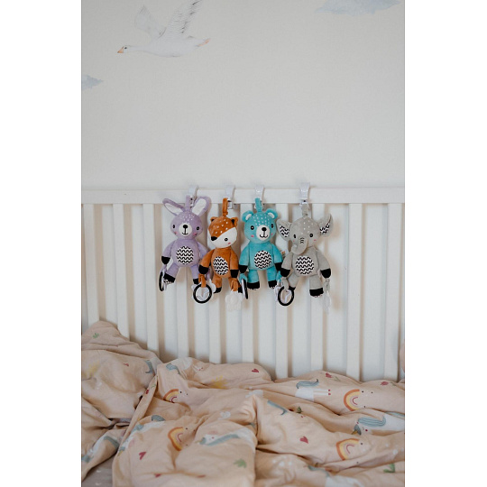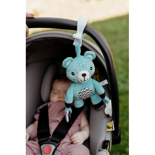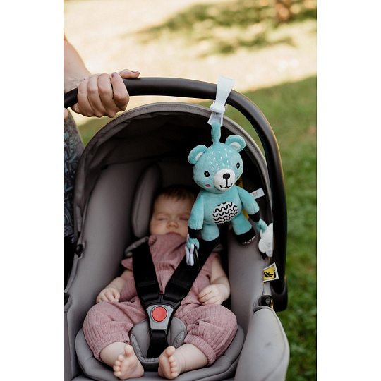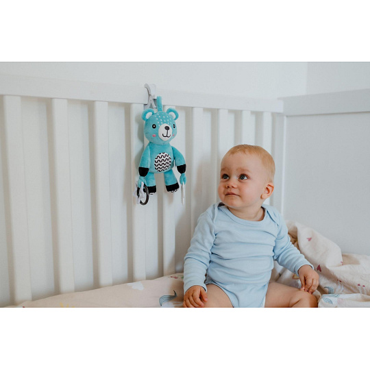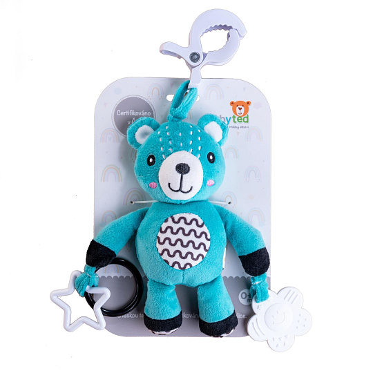 Roztomilý plyšový medvídek je skvělým kamarádem pro miminka již od narození. Díky praktickému závěsnému klipu jej lze jednoduše připevnit na kočárek, postýlku, autosedačku nebo hrací hrazdičku. Miminko tak může mít svého hebkého medvídka stále u sebe – ať už doma nebo na cestách. Medvídek je vyroben z měkkého a příjemného plyše, ideálního pro mazlení a první dotyky. V tělíčku má zabudované jemné chrastítko, které podporuje sluchový rozvoj dítěte a přitahuje jeho pozornost. Na koncích ručiček jsou uchyceny bezpečné plastové tvary (hvězdička a kytička), které rozvíjejí jemnou motoriku a hmatové vnímání. Hračka je certifikována v ČR, což zaručuje, že splňuje přísné bezpečnostní normy a je vhodná pro děti od narození.
