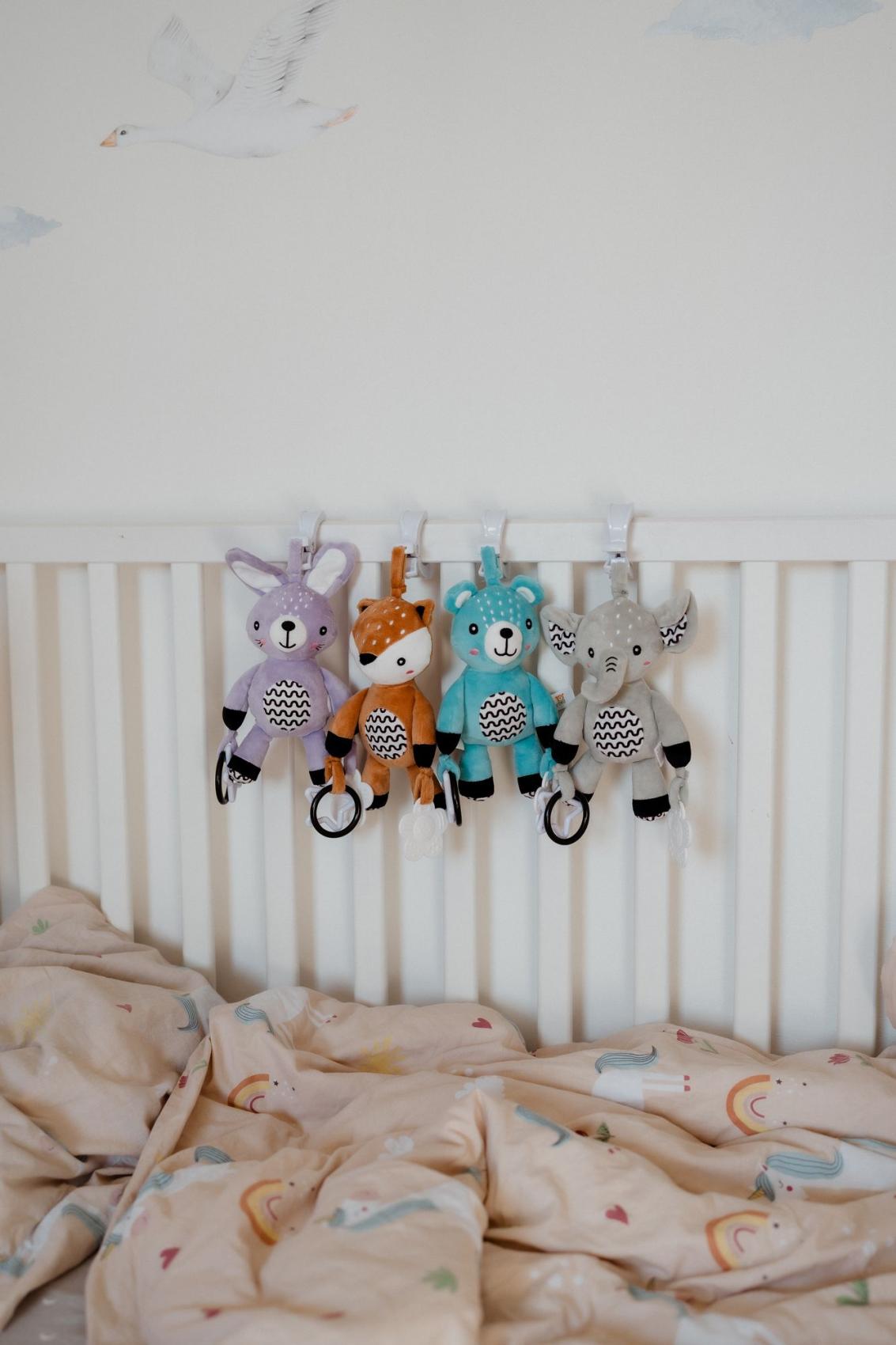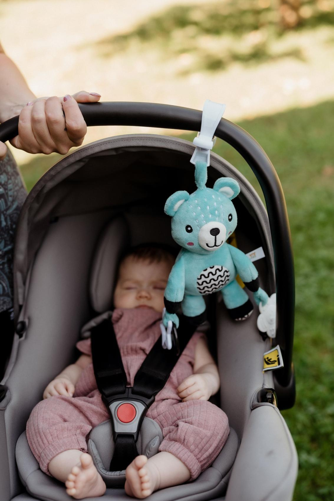 Roztomilý plyšový medvídek je skvělým kamarádem pro miminka již od narození. Díky praktickému závěsnému klipu jej lze jednoduše připevnit na kočárek, postýlku, autosedačku nebo hrací hrazdičku. Miminko tak může mít svého hebkého medvídka stále u sebe – ať už doma nebo na cestách. Medvídek je vyroben z měkkého a příjemného plyše, ideálního pro mazlení a první dotyky. V tělíčku má zabudované jemné chrastítko, které podporuje sluchový rozvoj dítěte a přitahuje jeho pozornost. Na koncích ručiček jsou uchyceny bezpečné plastové tvary (hvězdička a kytička), které rozvíjejí jemnou motoriku a hmatové vnímání. Hračka je certifikována v ČR, což zaručuje, že splňuje přísné bezpečnostní normy a je vhodná pro děti od narození.