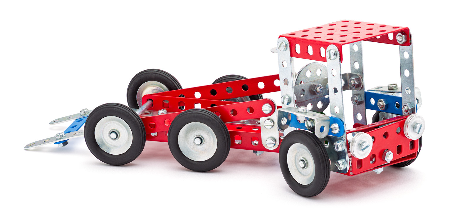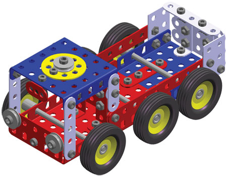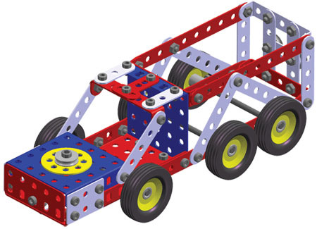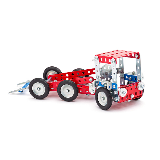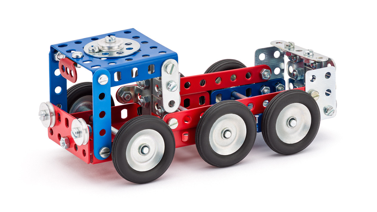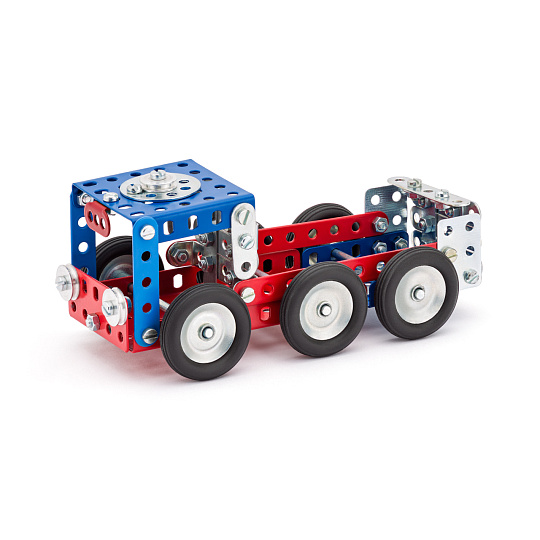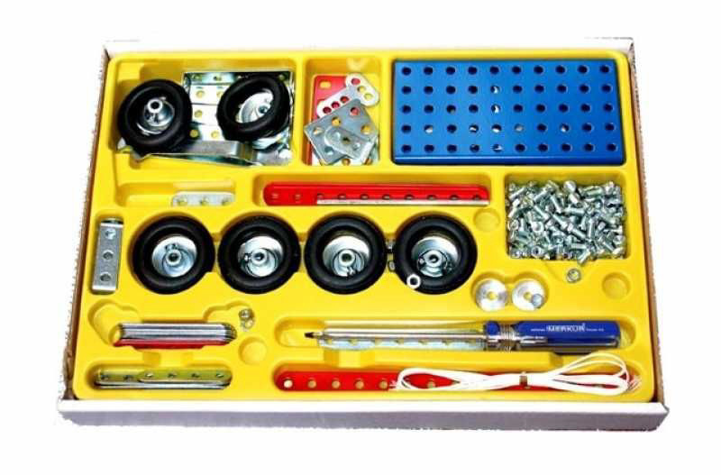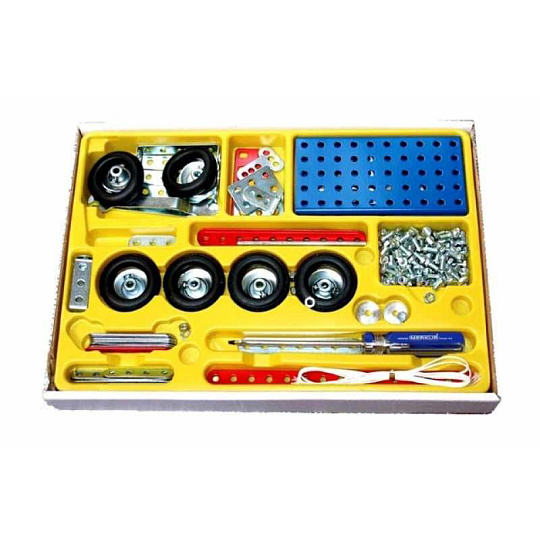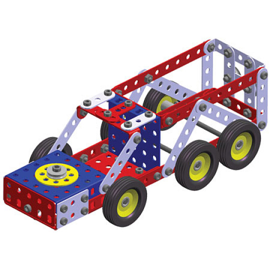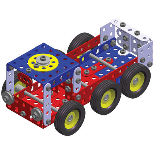 Univerzální jednovrstvá klasická stavebnice s návodem na stavbu 30 různých modelů. Obsahuje základní sestavu dílů jako jsou pásky, oblouky, plotničky, úhelníky, malá kola, pneumatiky, včetně šroubků a matiček. Součástí stavebnice je návodová knížka s návodem na stavbu 30 různých modelů jako je pásová pila, vagón, jeřáb, nákladní auto nebo výtah. Na začátku návodu jsou popsány a zobrazeny základní úkony jako spojování dílců, použití kontramatky, řešení lanových převodů, nebo uložení hřídelí v ložiscích. Stavebnice obsahuje kvalitní kovové díly, které se snadno spojují šroubky, což podporuje rozvoj jemné motoriky, logického myšlení a soustředění. Sada obsahuje: 273 dílků. Úroveň Merkur obtížnosti: 3. Baleno v krabičce. Rozměry balení: 27 x 36 x 5,8 cm. Nevhodné pro děti mladší 3 let. Věk: 5+