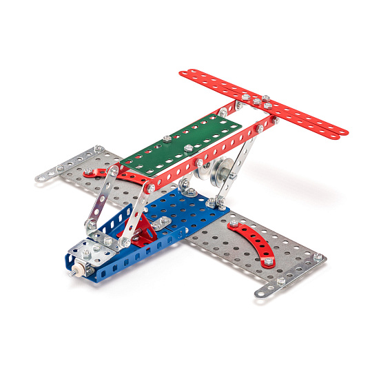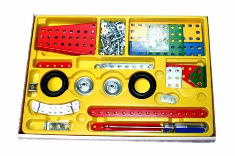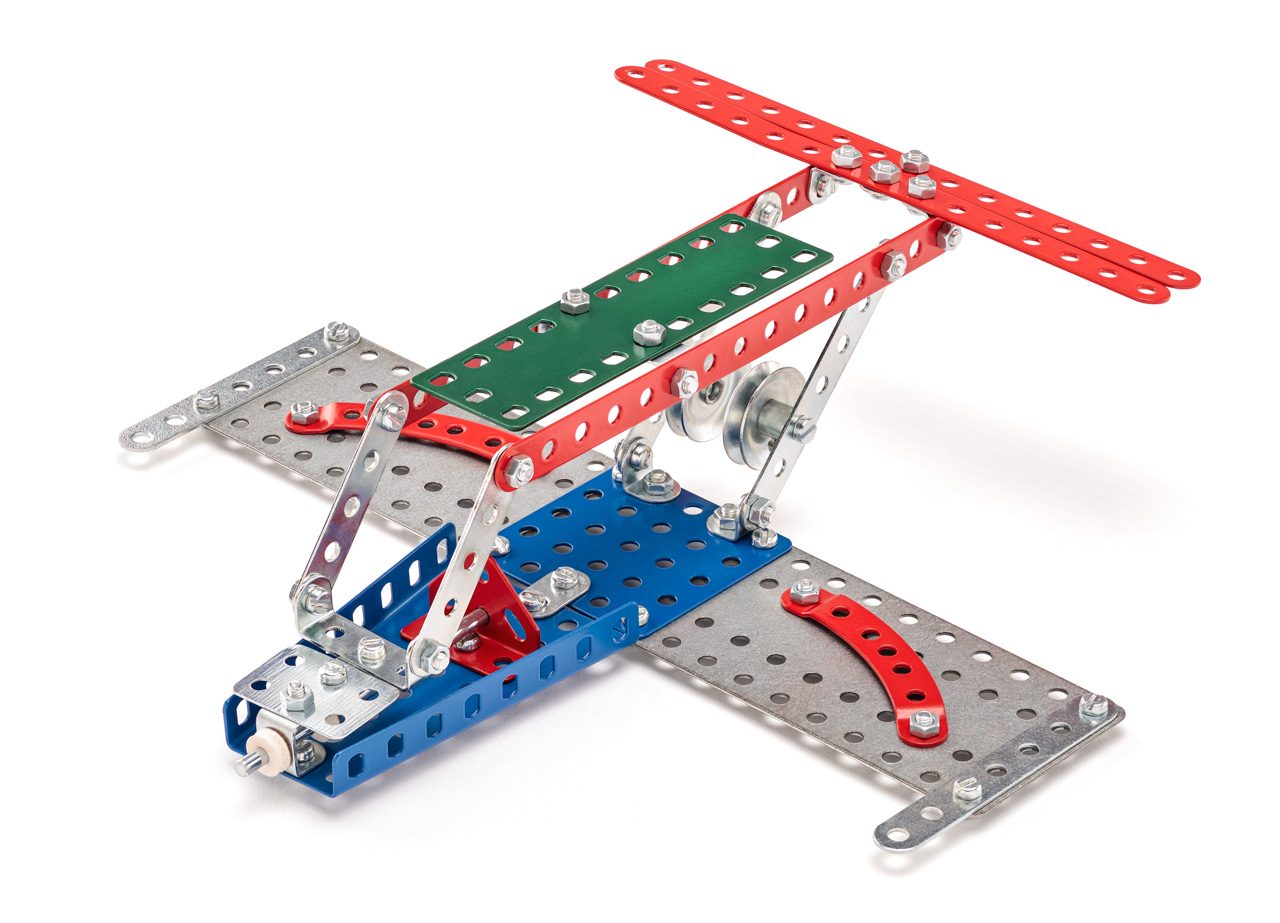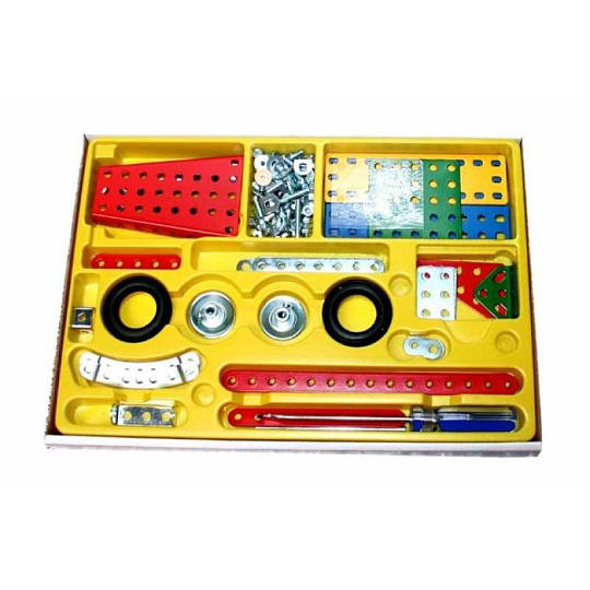 Univerzální jednovrstvá klasická stavebnice s návodem na stavbu 30 různých modelů. Obsahuje základní sestavu dílů jako jsou pásky, oblouky, plotničky, úhelníky, malá kola, pneumatiky, včetně šroubků a matiček. Součástí stavebnice je návodová knížka s návodem na stavbu 30 různých modelů jako je pásová pila, vagón, jeřáb, nákladní auto nebo výtah. Na začátku návodu jsou popsány a zobrazeny základní úkony jako spojování dílců, použití kontramatky, řešení lanových převodů, nebo uložení hřídelí v ložiscích. Stavebnice obsahuje kvalitní kovové díly, které se snadno spojují šroubky, což podporuje rozvoj jemné motoriky, logického myšlení a soustředění. Sada obsahuje: 273 dílků. Úroveň Merkur obtížnosti: 3. Baleno v krabičce. Rozměry balení: 27 x 36 x 5,8 cm. Nevhodné pro děti mladší 3 let. Věk: 5+