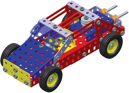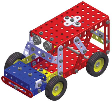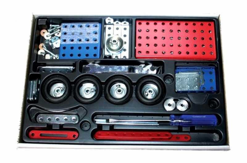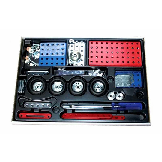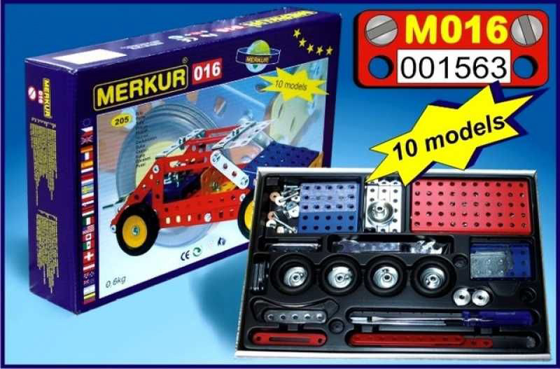 Univerzální jednovrstvá klasická stavebnice s návodem na stavbu 30 různých modelů. Obsahuje základní sestavu dílů jako jsou pásky, oblouky, plotničky, úhelníky, malá kola, pneumatiky, včetně šroubků a matiček. Součástí stavebnice je návodová knížka s návodem na stavbu 30 různých modelů jako je pásová pila, vagón, jeřáb, nákladní auto nebo výtah. Na začátku návodu jsou popsány a zobrazeny základní úkony jako spojování dílců, použití kontramatky, řešení lanových převodů, nebo uložení hřídelí v ložiscích. Stavebnice obsahuje kvalitní kovové díly, které se snadno spojují šroubky, což podporuje rozvoj jemné motoriky, logického myšlení a soustředění. Sada obsahuje: 273 dílků. Úroveň Merkur obtížnosti: 3. Baleno v krabičce. Rozměry balení: 27 x 36 x 5,8 cm. Nevhodné pro děti mladší 3 let. Věk: 5+