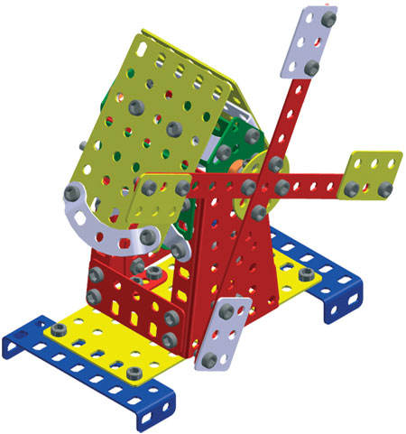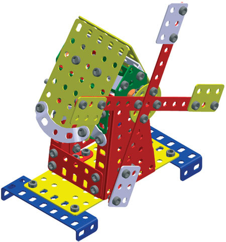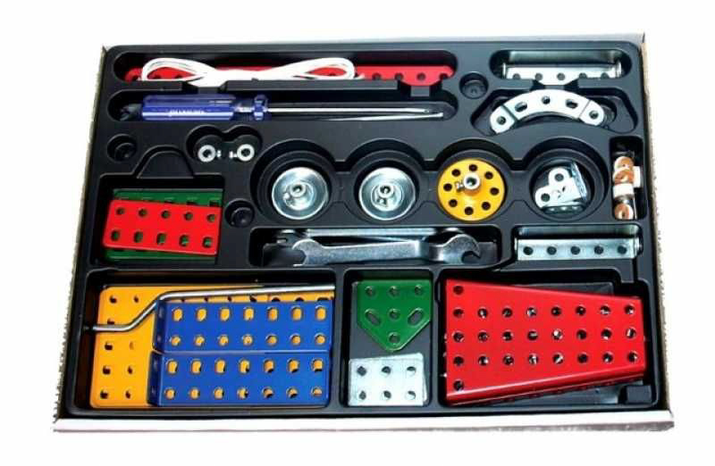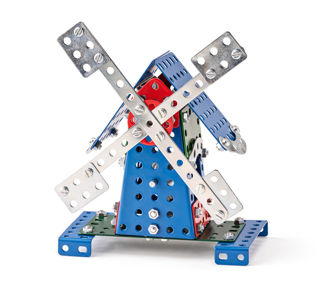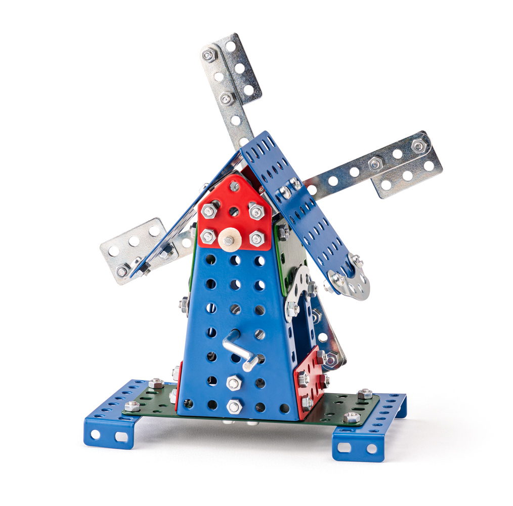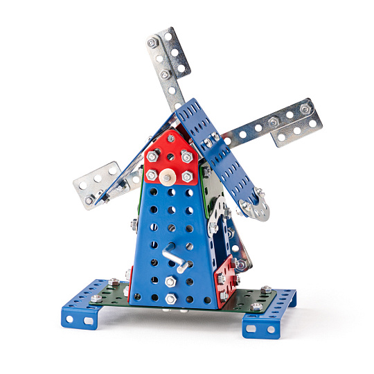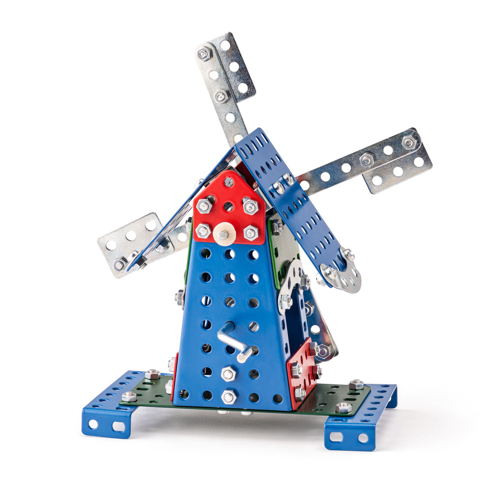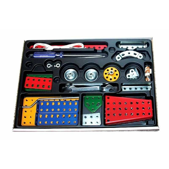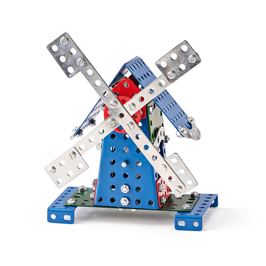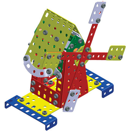 Univerzální jednovrstvá klasická stavebnice s návodem na stavbu 30 různých modelů. Obsahuje základní sestavu dílů jako jsou pásky, oblouky, plotničky, úhelníky, malá kola, pneumatiky, včetně šroubků a matiček. Součástí stavebnice je návodová knížka s návodem na stavbu 30 různých modelů jako je pásová pila, vagón, jeřáb, nákladní auto nebo výtah. Na začátku návodu jsou popsány a zobrazeny základní úkony jako spojování dílců, použití kontramatky, řešení lanových převodů, nebo uložení hřídelí v ložiscích. Stavebnice obsahuje kvalitní kovové díly, které se snadno spojují šroubky, což podporuje rozvoj jemné motoriky, logického myšlení a soustředění. Sada obsahuje: 273 dílků. Úroveň Merkur obtížnosti: 3. Baleno v krabičce. Rozměry balení: 27 x 36 x 5,8 cm. Nevhodné pro děti mladší 3 let. Věk: 5+