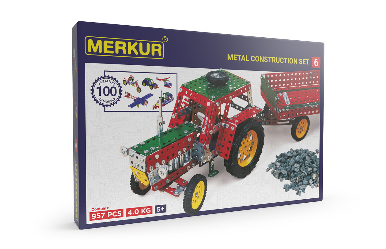 Třívrstvá klasická velká stavebnice. Stavebnice obsahuje všechny součástky jako Merkur M4 a ještě celou řadu dalších součástek jako jsou pásy, velká kola, dlouhé úhelníky, pásky atd. Součástí stavebnice je velká návodová knížka s návodem na stavbu 80 různých modelů jako je bagr, kolesové rypadlo, nákladní automobil, pásový traktor, jeřáb atd. Stavebnice obsahuje 768 dílků. Vhodné i pro děti, které s Merkurem začínají. Se sestavenými modely si lze hrát, jsou velmi odolné. Rozměr balení: 36 x 27 x 8 cm. Nevhodné pro děti mladší 3 let. Věk: 5+