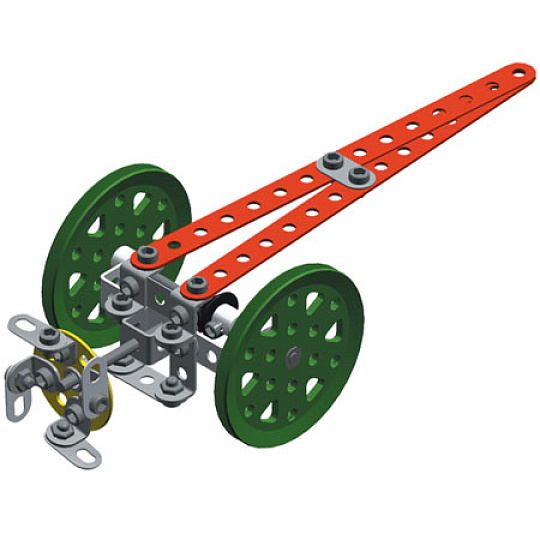 Univerzální jednovrstvá klasická stavebnice s návodem na stavbu 30 různých modelů. Obsahuje základní sestavu dílů jako jsou pásky, oblouky, plotničky, úhelníky, malá kola, pneumatiky, včetně šroubků a matiček. Součástí stavebnice je návodová knížka s návodem na stavbu 30 různých modelů jako je pásová pila, vagón, jeřáb, nákladní auto nebo výtah. Na začátku návodu jsou popsány a zobrazeny základní úkony jako spojování dílců, použití kontramatky, řešení lanových převodů, nebo uložení hřídelí v ložiscích. Stavebnice obsahuje kvalitní kovové díly, které se snadno spojují šroubky, což podporuje rozvoj jemné motoriky, logického myšlení a soustředění. Sada obsahuje: 273 dílků. Úroveň Merkur obtížnosti: 3. Baleno v krabičce. Rozměry balení: 27 x 36 x 5,8 cm. Nevhodné pro děti mladší 3 let. Věk: 5+