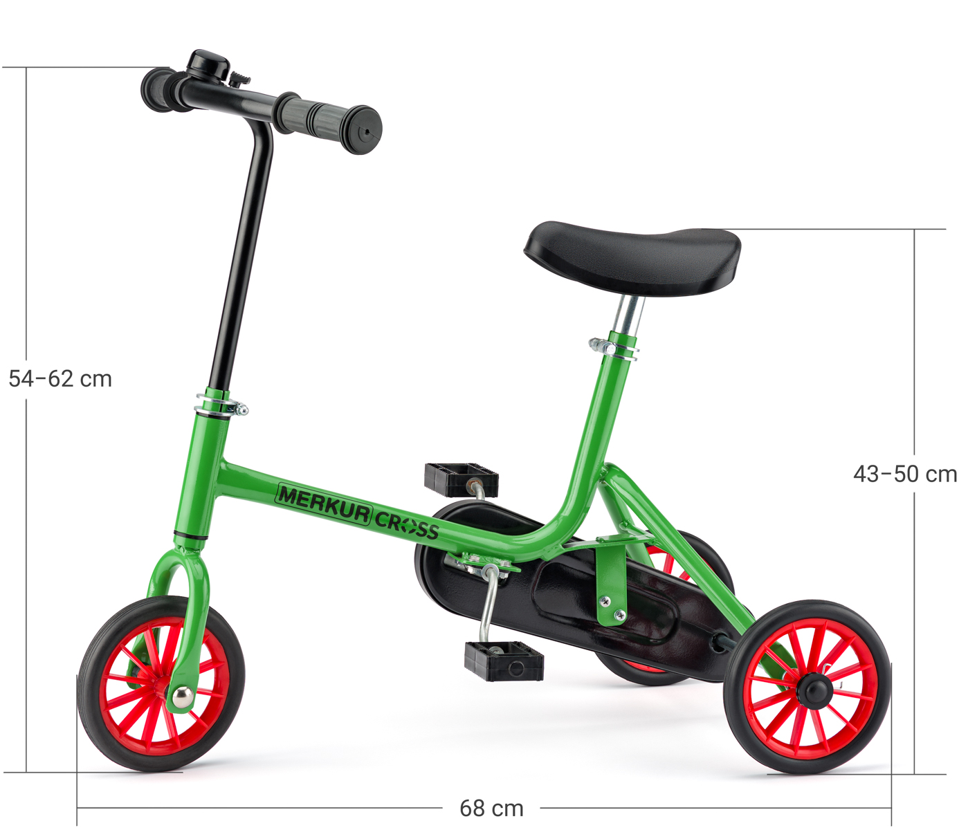 Klasická velice oblíbená tříkolka s řetězovým pohonem zadních kol. Tříkolka je vybavena výškově nastavitelným sedátkem a přední vidlicí. Rozměr: 62cm výška x 40cm šířka x 70cm délka. Hmotnost: 3,6 kg. Tříkolka je sestavena a balena v igelitovém pytli. Barva zelená. Tříkolka nemá klasickou brzdu, ale brzdí se šlápnutím dozadu. Věk: 3+ Nosnost: 20kg. -Řidítka: Od země k ručkám – min. 55cm, Rozpětí ruček - 20cm od sebe. -Od země k horní ploše sedátka – min. 43cm, max. 49,5cm, Špička sedátka k řídítkům – 30cm Šlapky: - Vršek šlapičky (spodní) od země 10cm, Vršek šlapičky (horní) od země 24,5cm. ...