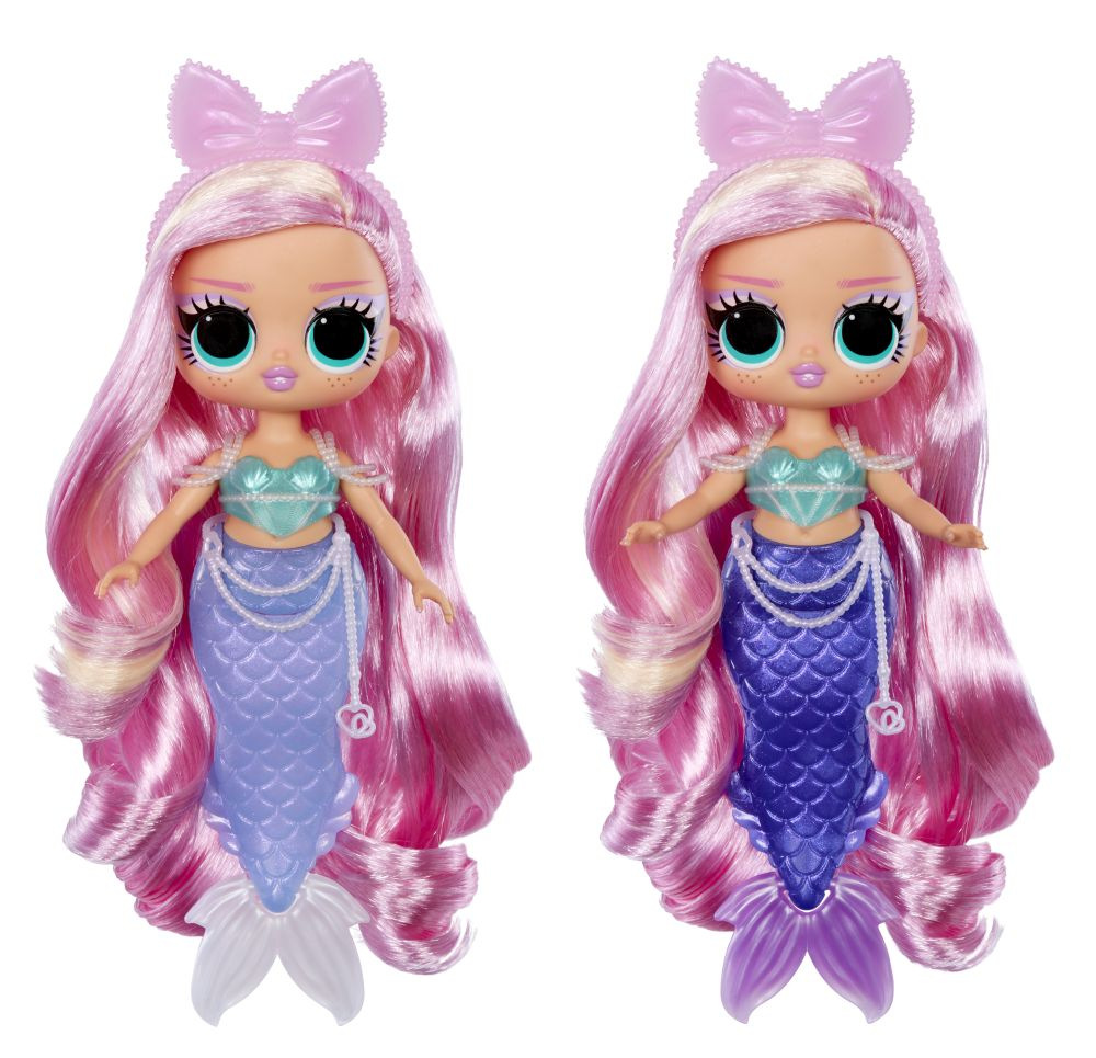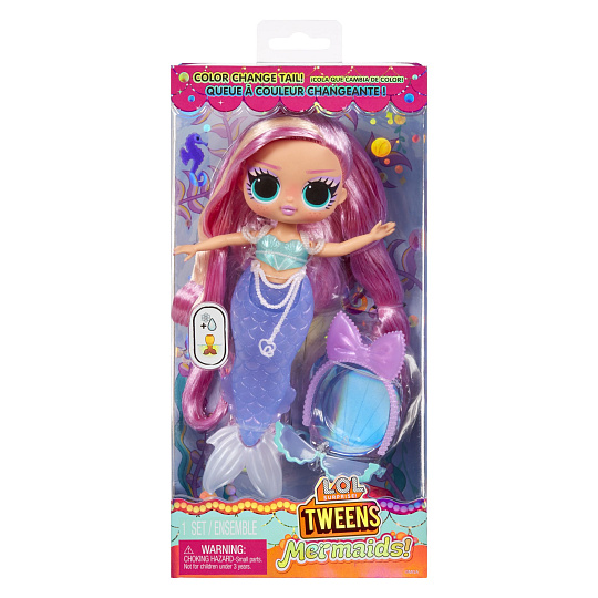 Představujeme 4 nové L.O.L. Surprise! Tweens rošťácké panenky, které se přeměnily na mořské panny s nádherně barevnou ploutví, která mění barvu, když ji ponoříš do ledové vody. Panenka dokáže na ploutvi stát. V balení najdeš spoustu tematických doplňků.