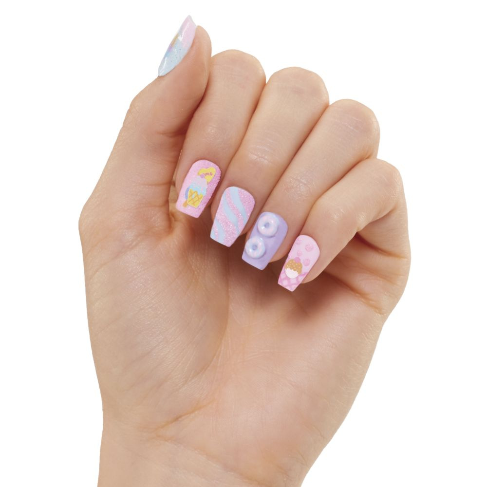 V balení najdeš více než 15 překvapení včetně nalepovacích nehtů, pilníku a laků na nehty. Každá panenka má jiné tematické studio. Nehty si můžeš ozdobit podle svého vkusu samolepkami a třpytkami.