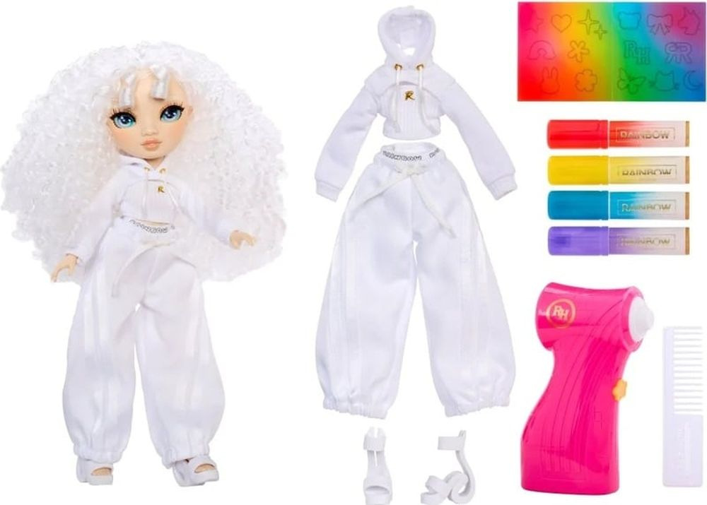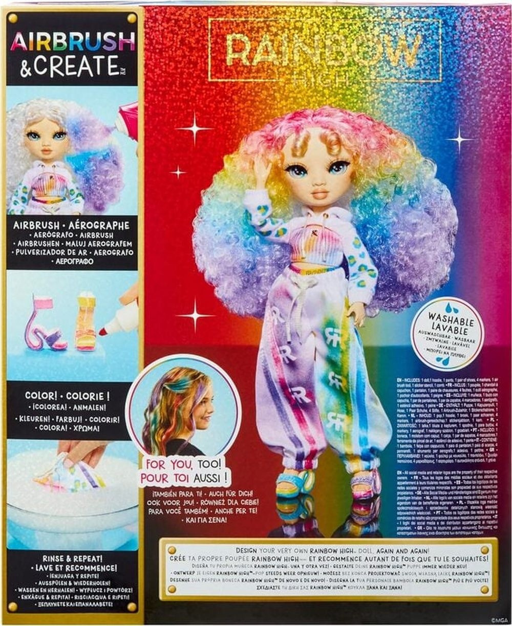 Cílem Rainbow High je podporovat kreativitu a sebevědomí prostřednictvím barev. Představujeme nový způsob, jak barevně stylovat panenku, kterou můžeš upravit podle své fantazie. Panenka je celá bílá, od hlavy až k patě, což ti umožní snadno vytvářet barevné variace a měnit její outfit nebo účes znovu a znovu. Můžeš použít omyvatelné fixy z balení v Airbrush pistoli nebo kreslit přímo na oblečení a vlasy. Poté stačí opláchnout a opakovat. Znovu a znovu.