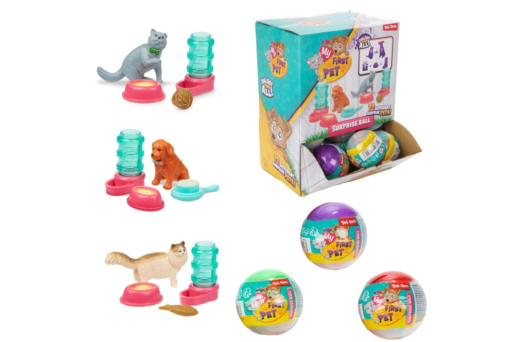 Kulička překvapení MY FIRST PET zvířátkem-překvapením (psem nebo kočkou) a 3 doplňky. V kuličce najdete: figurku pejska nebo kočičky, misku s krmivem, dávkovač krmiva, příslušenství překvapení. K sesbírání je 12 vzorů zvířátek. Velikost kuličky je 6 cm. Vhodné pro děti od 3 let