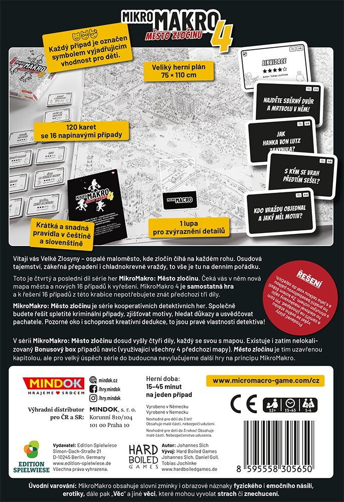 Toto je čtvrtý a poslední díl série her MikroMakro: Město zločinu. Čeká vás v něm nová mapa města a nových 16 případů k vyřešení. MikroMakro 4 je samostatná hra a k řešení 16 případů z této krabice nepotřebujete znát předchozí tři díly.