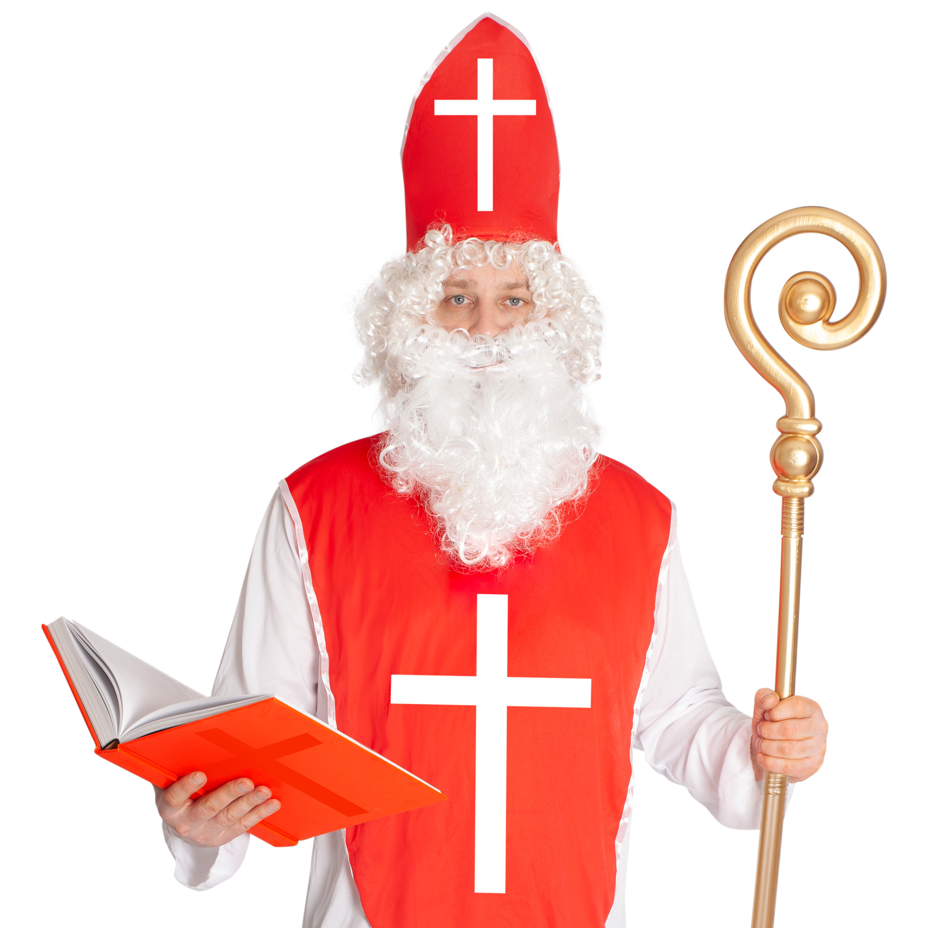 Karnevalový kostým mikuláše pro dospělé. Kostým obsahuje mikulášskou čepici na suchý zip, dlouhé bíle roucho a červenou náprsenku s bílým křížem. Neobsahuje hůl, knihu ani vousy! Délka bílého roucha od ramen dolů je cca 145 cm.