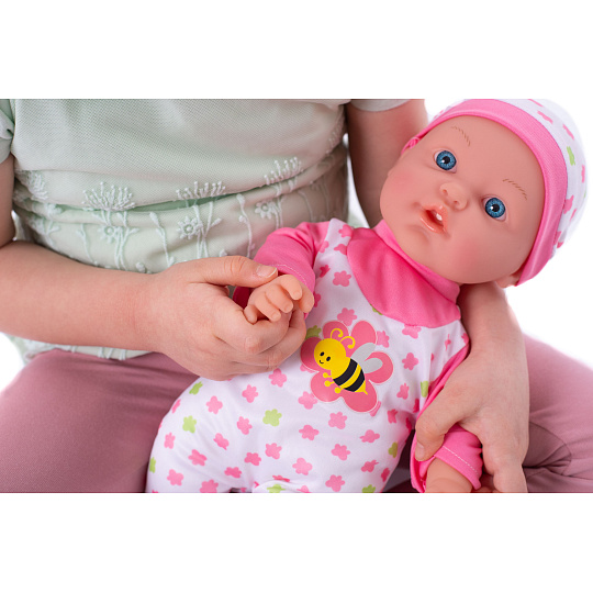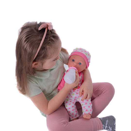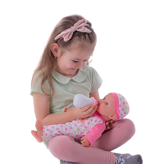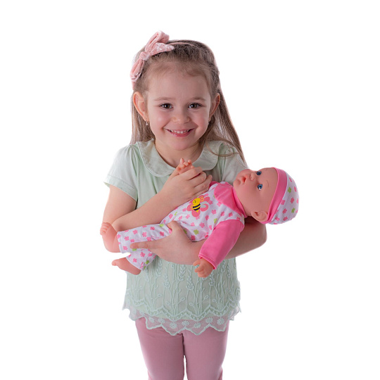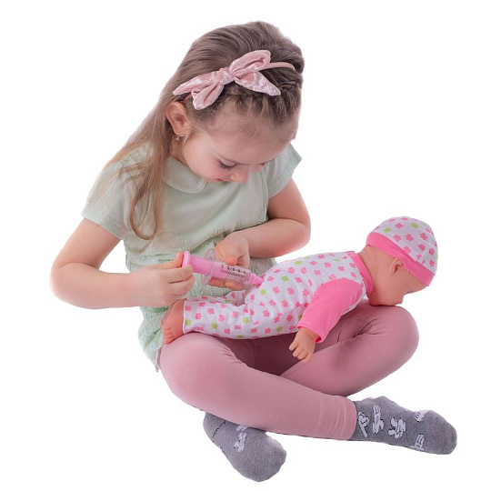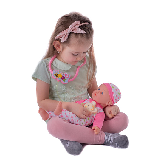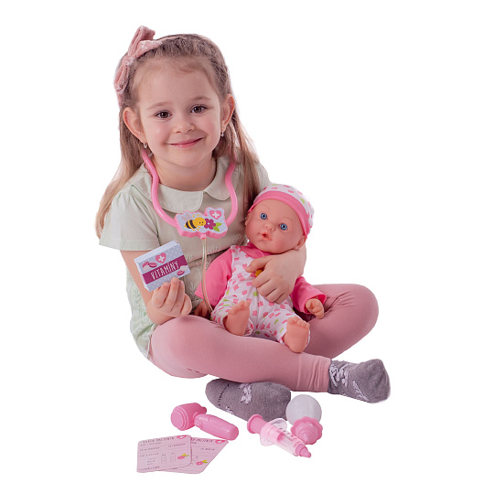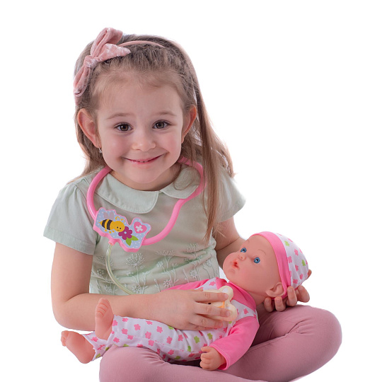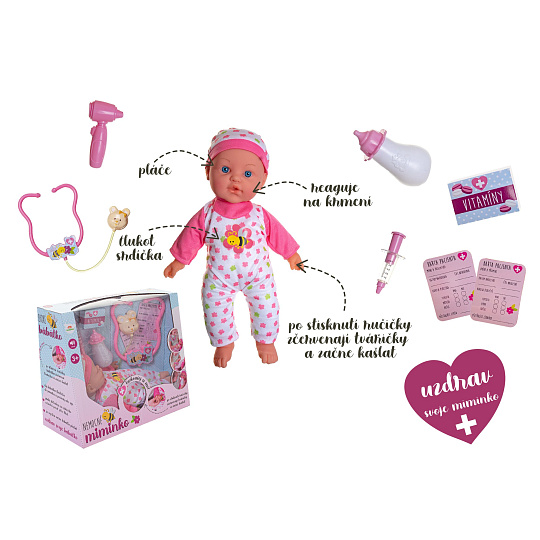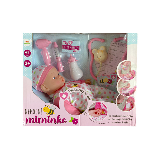 Nemocné miminko, které potřebuje pomoc od malých maminek či budoucích lékařek. K tomu jsou potřeba zdravotnické potřeby, které sada obsahuje. Panenka má měkké tělo a je se zvukem a světlem. Po stisknutí ručičky jí zčervenají tvářičky a začne kašlat. Přilož stetoskop na srdíčko a uslyšíš jeho tlukot. Po injekci začne miminko plakat. Dej miminku lahvičku do pusinky a poslouchej, jak pije. Uzdrav svoje miminko. Balení obsahuje stetoskop, injekční stříkačku, kukátko do uší, lahvičku, krabičku s nápisem VITAMÍNY a kartu pacienta. Panenka je velikosti 36 cm. Baterie 3x AG13 jsou součástí balení a slouží pouze pro předváděcí účely, doporučujeme baterie vyměnit za nové. Rozměry balení 37 x 31 x 17 cm Vhodné pro děti od 3 let