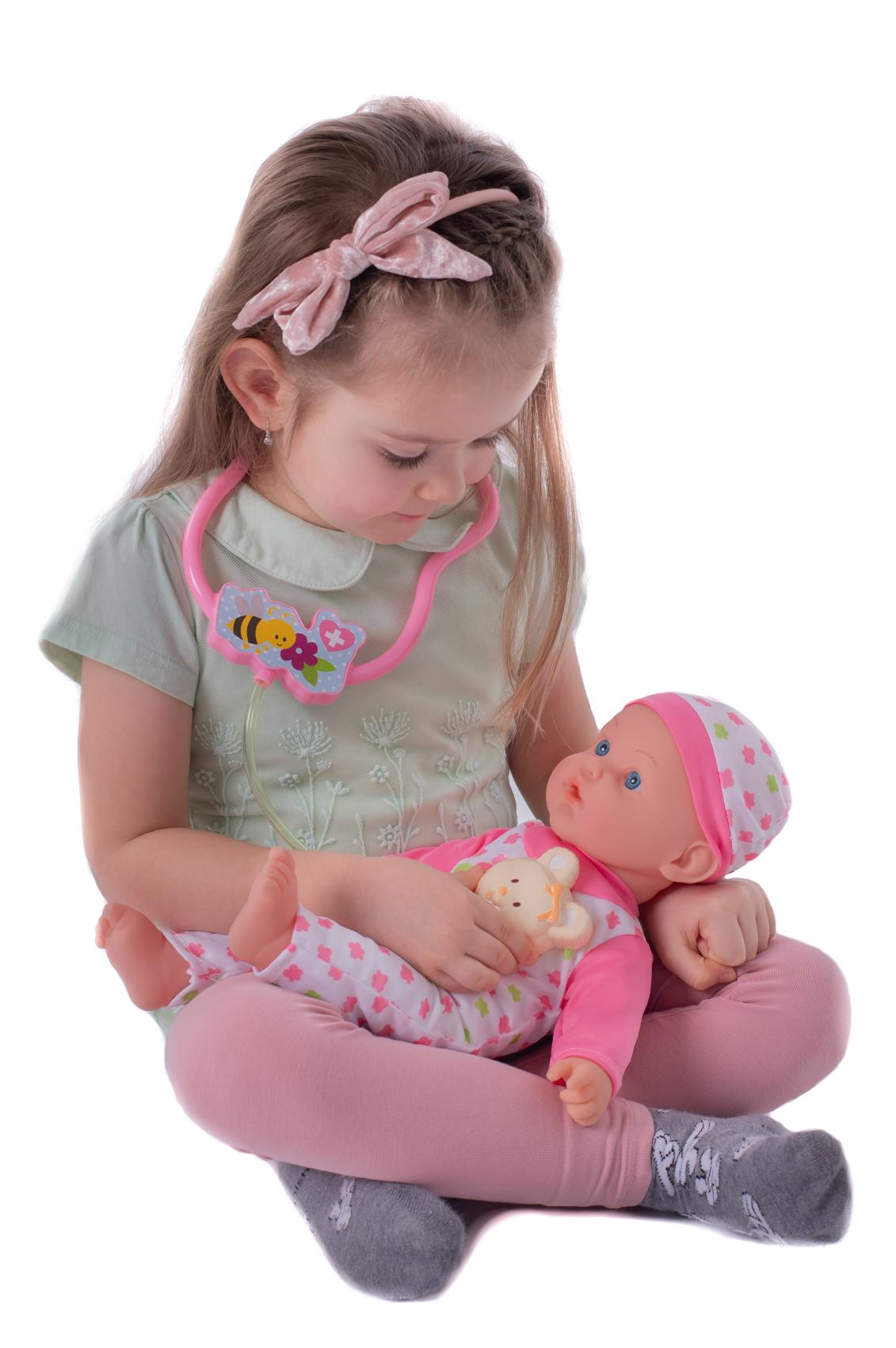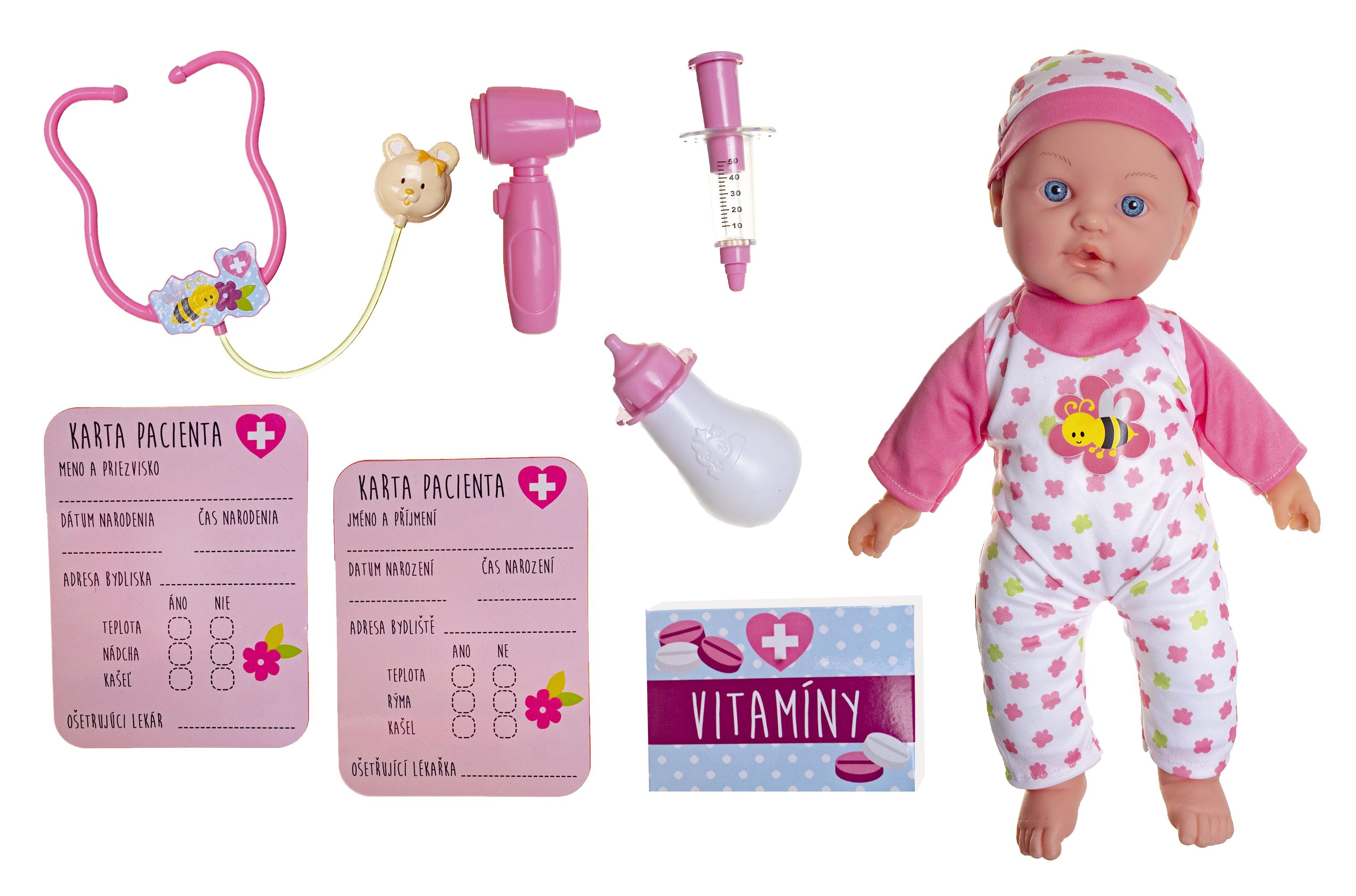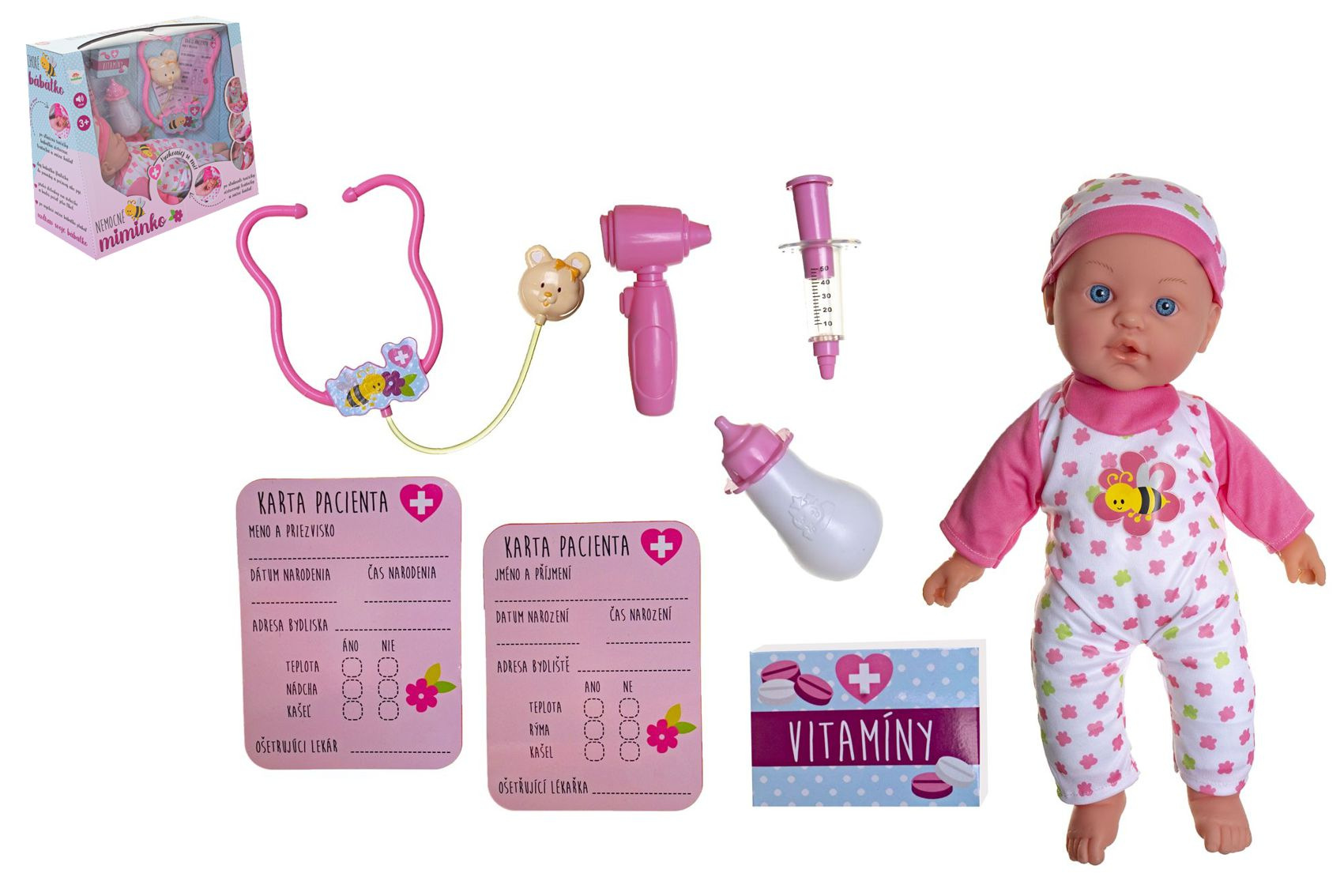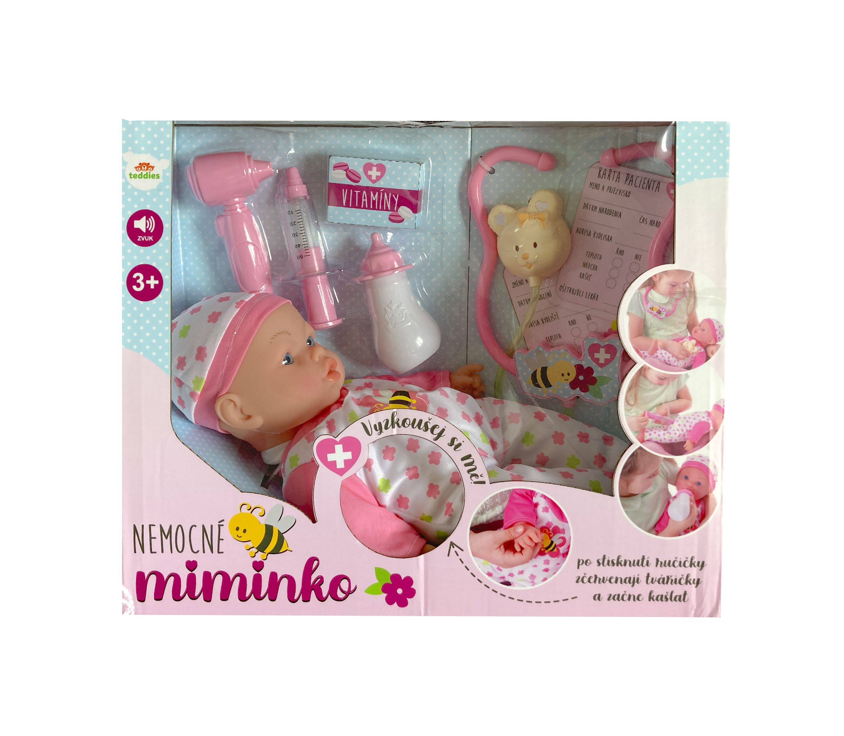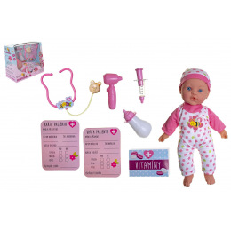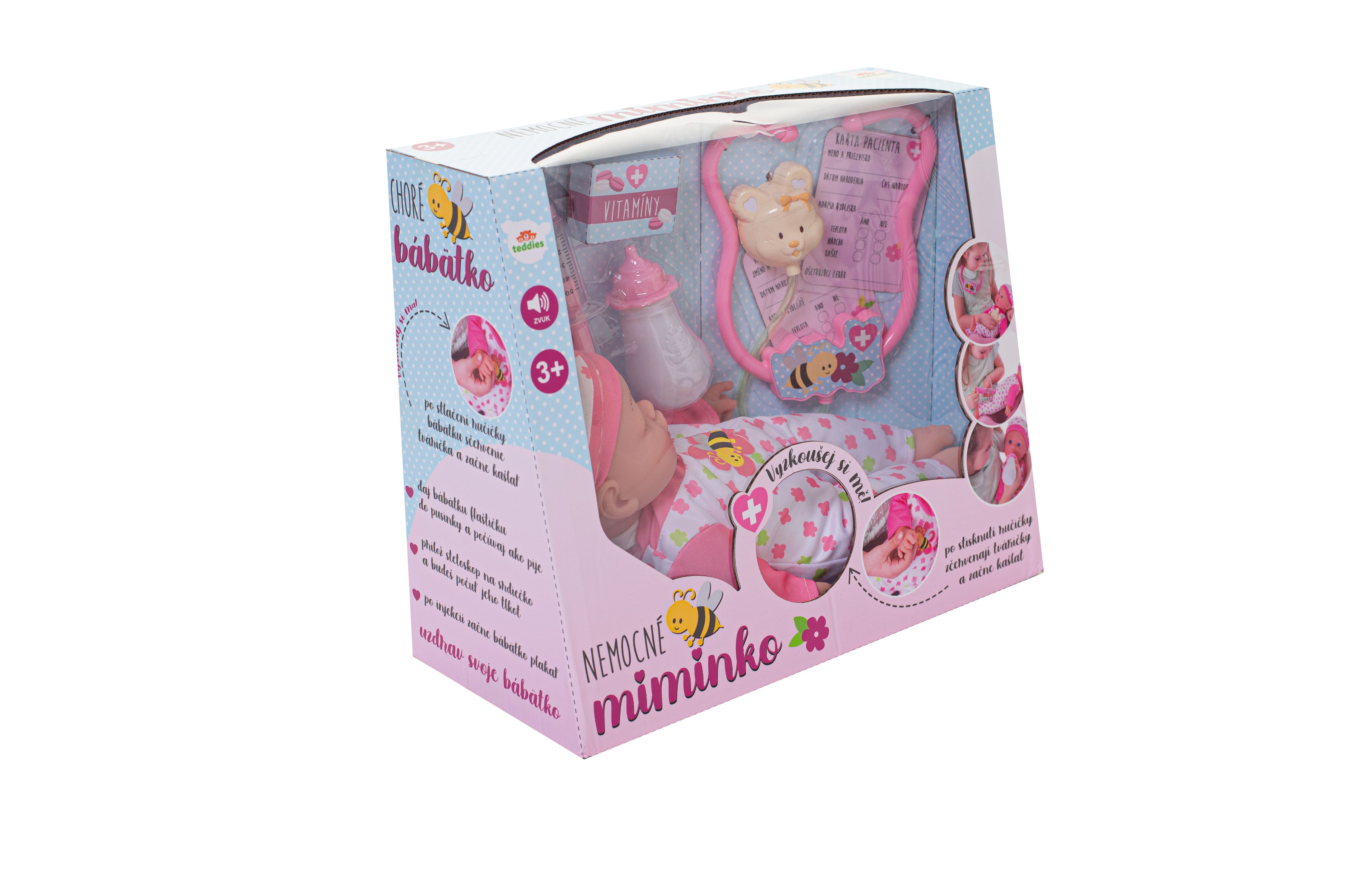 Nemocné miminko, které potřebuje pomoc od malých maminek či budoucích lékařek. K tomu jsou potřeba zdravotnické potřeby, které sada obsahuje. Panenka má měkké tělo a je se zvukem a světlem. Po stisknutí ručičky jí zčervenají tvářičky a začne kašlat. Přilož stetoskop na srdíčko a uslyšíš jeho tlukot. Po injekci začne miminko plakat. Dej miminku lahvičku do pusinky a poslouchej, jak pije. Uzdrav svoje miminko. Balení obsahuje stetoskop, injekční stříkačku, kukátko do uší, lahvičku, krabičku s nápisem VITAMÍNY a kartu pacienta. Panenka je velikosti 36 cm. Baterie 3x AG13 jsou součástí balení a slouží pouze pro předváděcí účely, doporučujeme baterie vyměnit za nové. Rozměry balení 37 x 31 x 17 cm Vhodné pro děti od 3 let