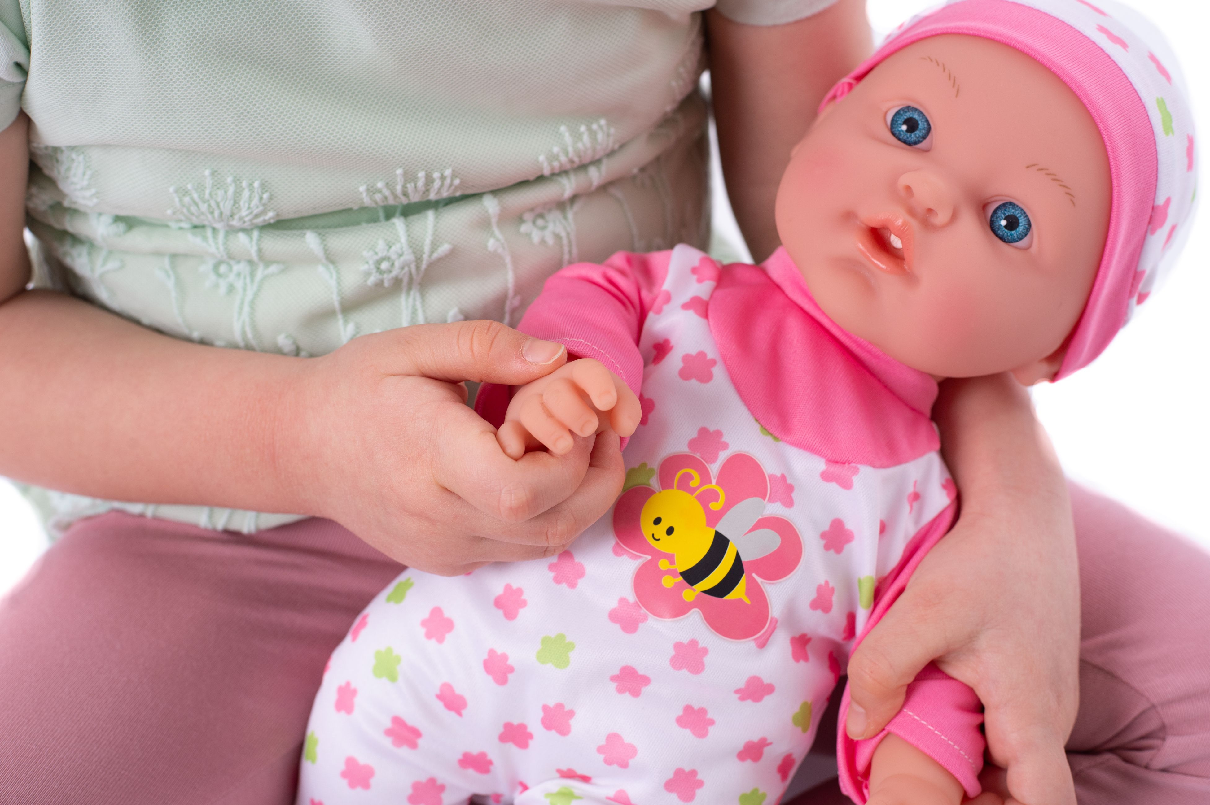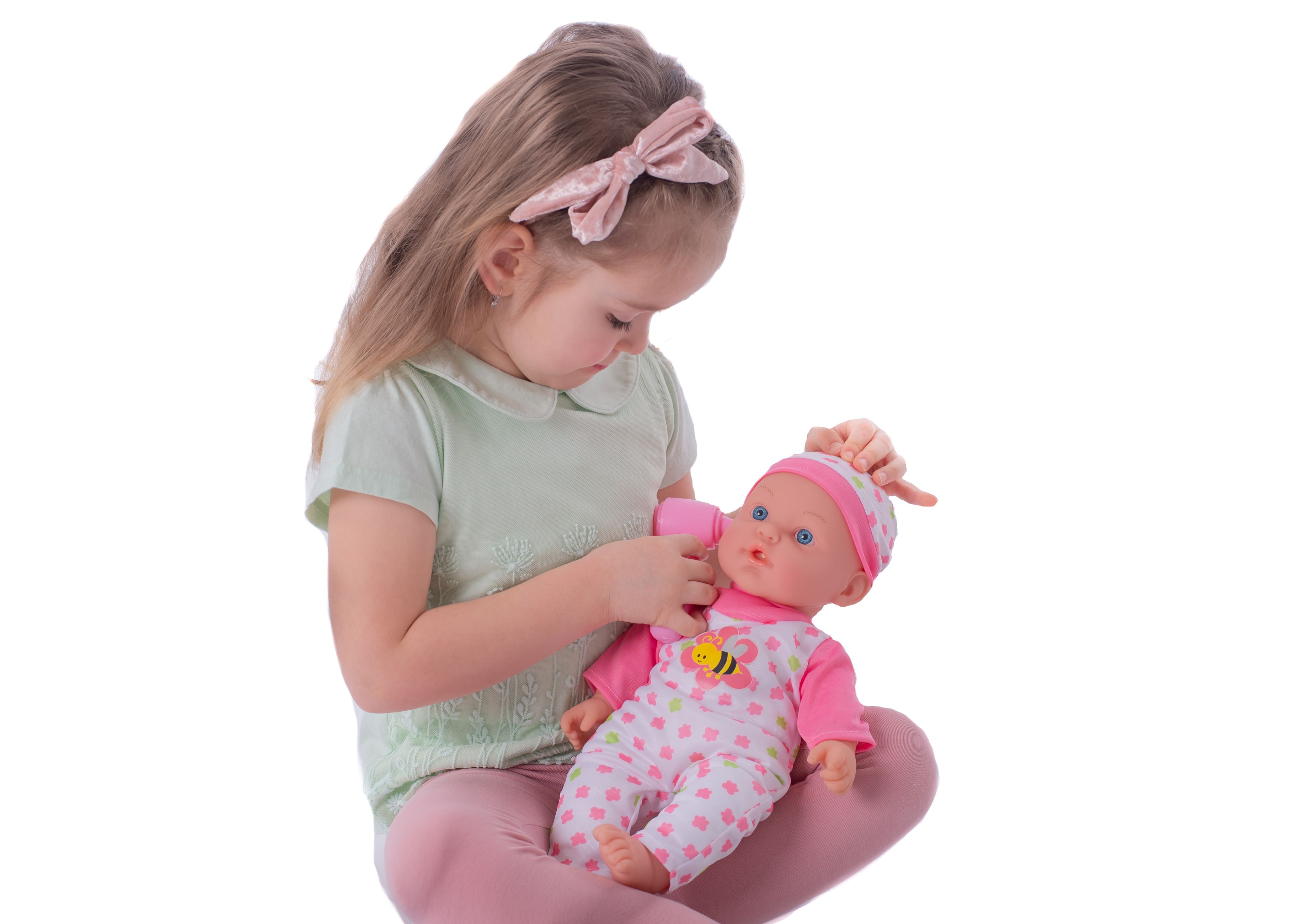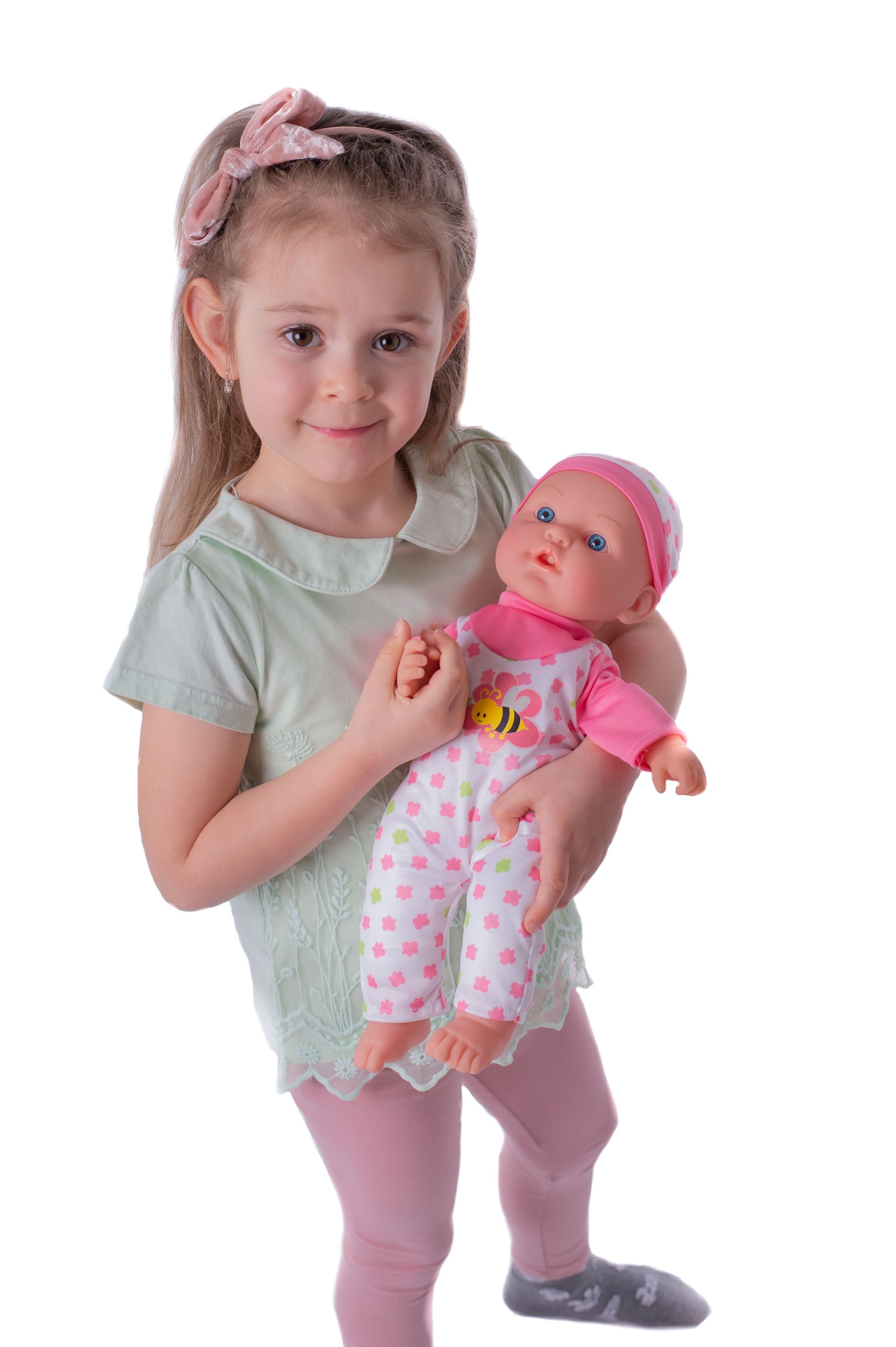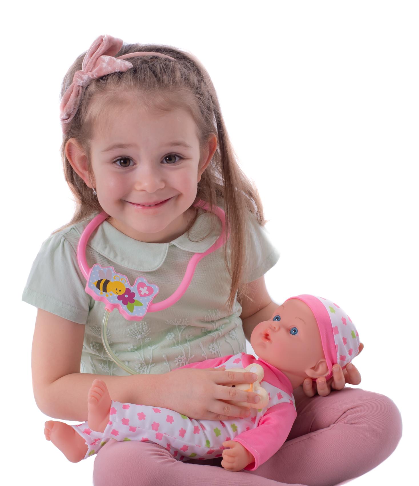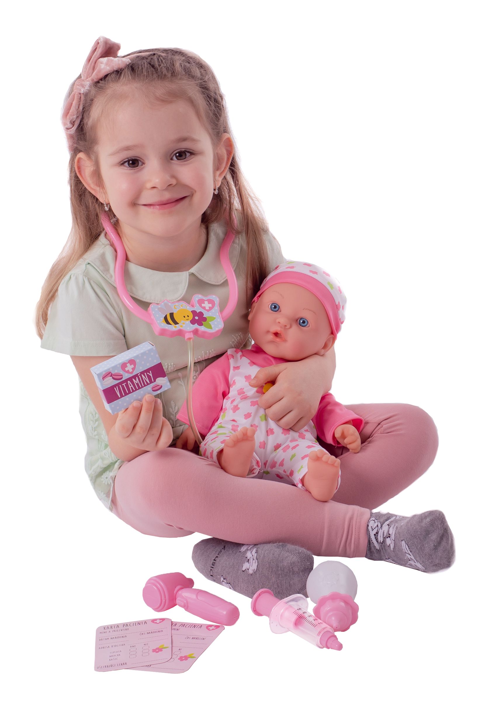 Nemocné miminko, které potřebuje pomoc od malých maminek či budoucích lékařek. K tomu jsou potřeba zdravotnické potřeby, které sada obsahuje. Panenka má měkké tělo a je se zvukem a světlem. Po stisknutí ručičky jí zčervenají tvářičky a začne kašlat. Přilož stetoskop na srdíčko a uslyšíš jeho tlukot. Po injekci začne miminko plakat. Dej miminku lahvičku do pusinky a poslouchej, jak pije. Uzdrav svoje miminko. Balení obsahuje stetoskop, injekční stříkačku, kukátko do uší, lahvičku, krabičku s nápisem VITAMÍNY a kartu pacienta. Panenka je velikosti 36 cm. Baterie 3x AG13 jsou součástí balení a slouží pouze pro předváděcí účely, doporučujeme baterie vyměnit za nové. Rozměry balení 37 x 31 x 17 cm Vhodné pro děti od 3 let