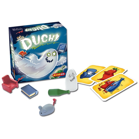 5 dřevěných předmětů ( duch, křeslo, lahev, kniha, myš ), 60 karet, česká a slovenská pravidla