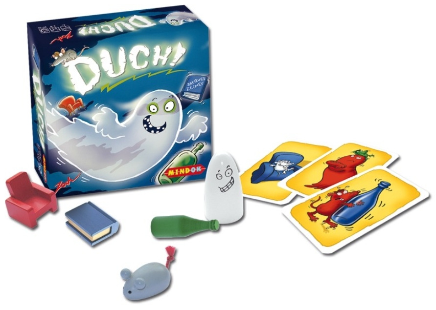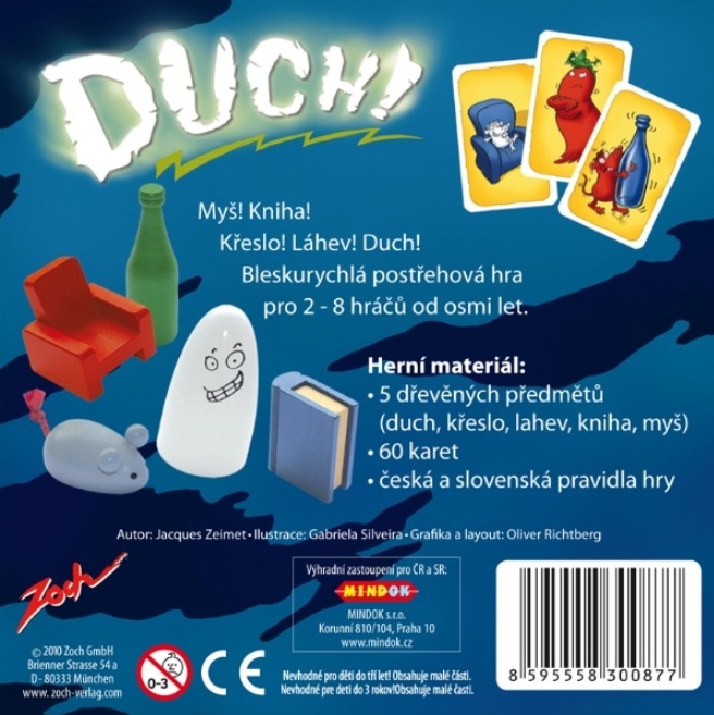 5 dřevěných předmětů ( duch, křeslo, lahev, kniha, myš ), 60 karet, česká a slovenská pravidla