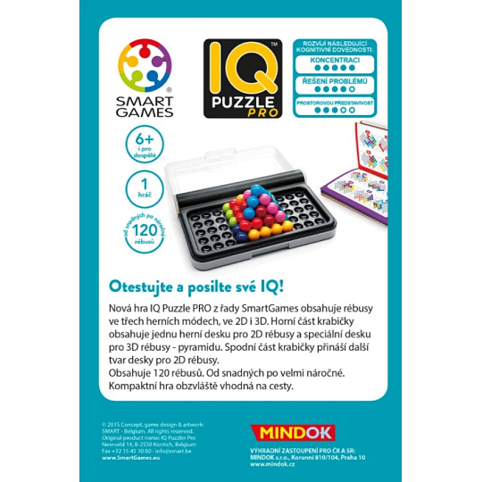 Otestujte a posilte své IQ s touto skvělou cestovní hrou! Nová hra IQ Puzzle Pro z řady Smart Games obsahuje 120 rébusů ve třech herních módech, ve 2D i 3D. Horní část krabičky obsahuje jednu herní desku pro 2D rébusy a speciální desku pro 3D rébusy - pyramidu. Spodní část krabičky přináší další tvar desky pro 2D rébusy. A to vše v malé kompaktní krabičce, ideální na cesty!