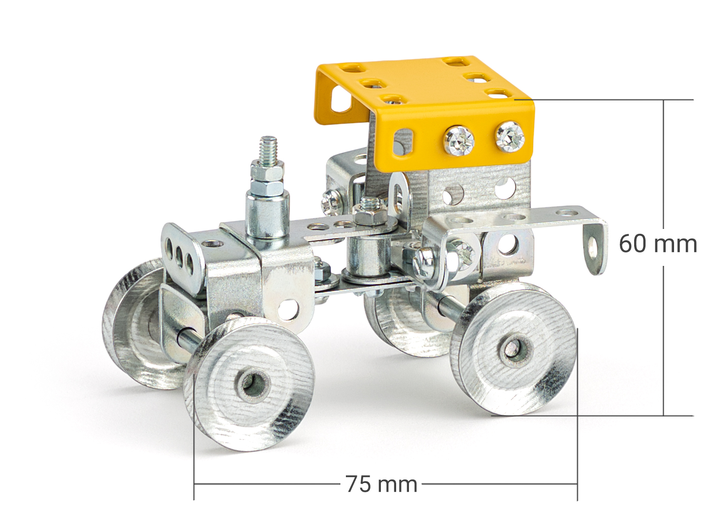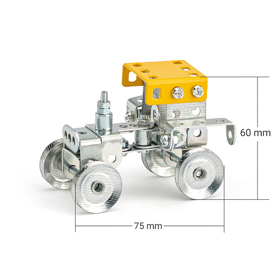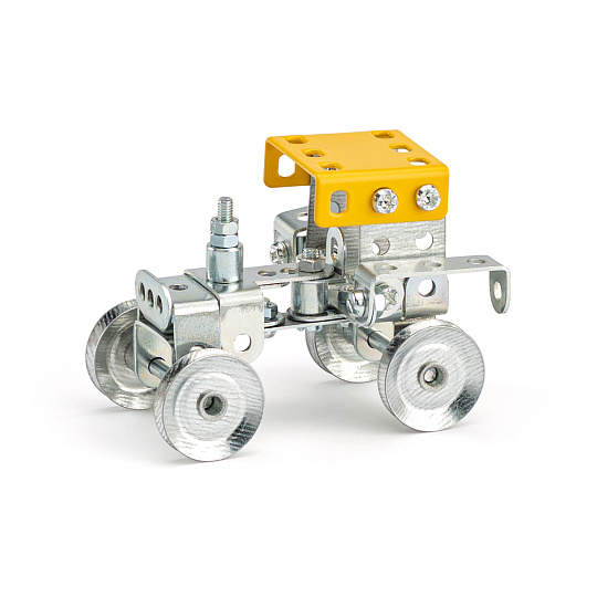 Univerzální jednovrstvá klasická stavebnice s návodem na stavbu 30 různých modelů. Obsahuje základní sestavu dílů jako jsou pásky, oblouky, plotničky, úhelníky, malá kola, pneumatiky, včetně šroubků a matiček. Součástí stavebnice je návodová knížka s návodem na stavbu 30 různých modelů jako je pásová pila, vagón, jeřáb, nákladní auto nebo výtah. Na začátku návodu jsou popsány a zobrazeny základní úkony jako spojování dílců, použití kontramatky, řešení lanových převodů, nebo uložení hřídelí v ložiscích. Stavebnice obsahuje kvalitní kovové díly, které se snadno spojují šroubky, což podporuje rozvoj jemné motoriky, logického myšlení a soustředění. Sada obsahuje: 273 dílků. Úroveň Merkur obtížnosti: 3. Baleno v krabičce. Rozměry balení: 27 x 36 x 5,8 cm. Nevhodné pro děti mladší 3 let. Věk: 5+