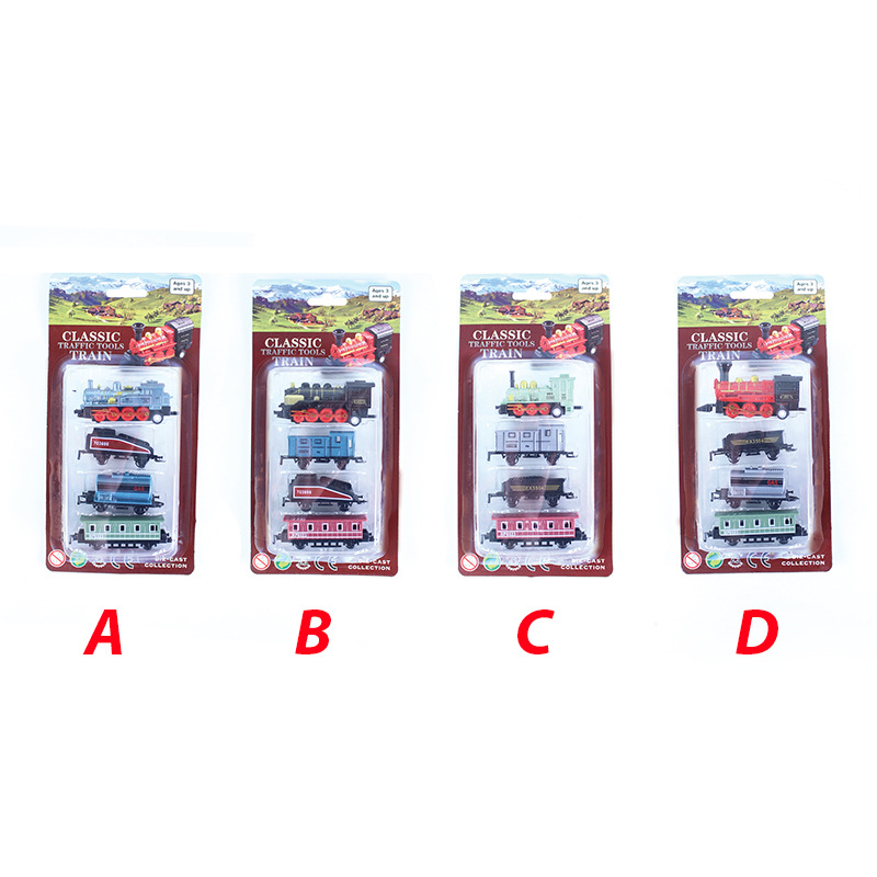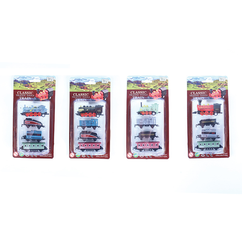 Mini vláček na zpětný setrvačník. Sada obsahuje kovovou lokomotivu a 3 plastové vagónky. Lokomotiva má délku cca 7 cm.