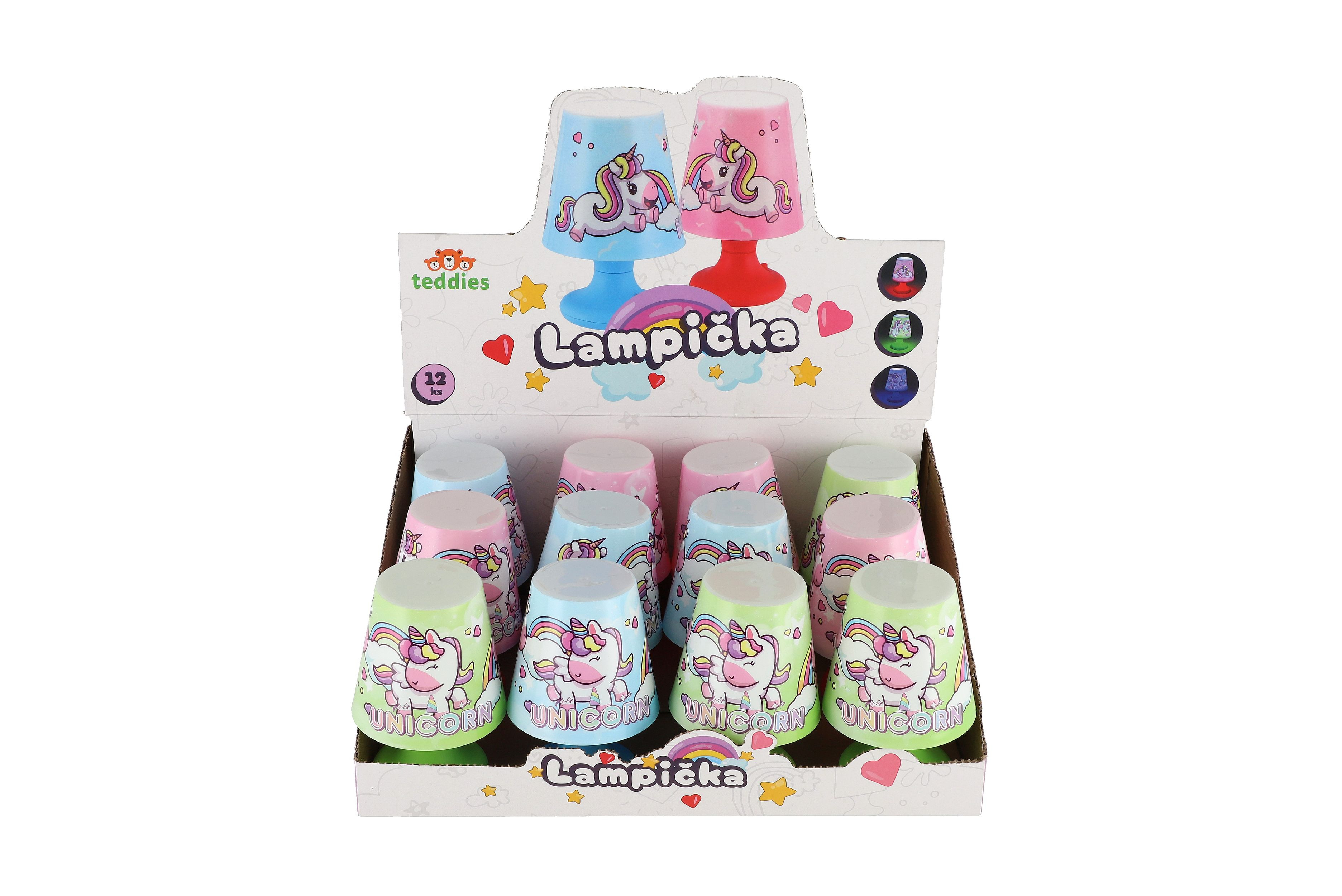 Mini lampička s jednorožcem na stůl plast 8x11cm na baterie 3 barvy 12ks v boxu