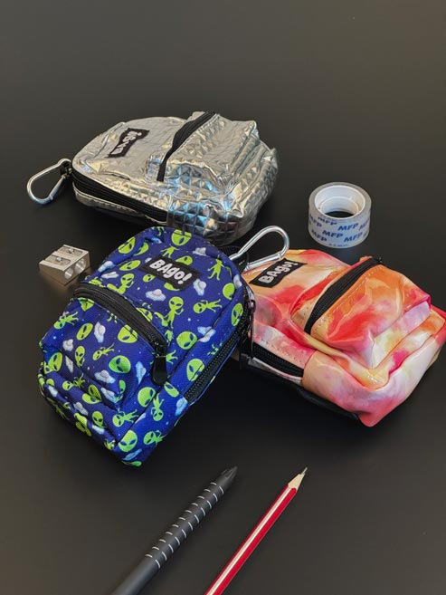 Minibatůžky v originálních designech. Disponují prostornou hlavní kapsou s dvoucestným zipem, která je ideální pro uložení drobných nezbytností. Přední kapsička se zipem nabízí další úložný prostor na malé předměty, jako jsou peníze nebo klíče. Na zadní straně mají dvě černé gumičky, které imitují ramenní popruhy a umožňují tak snadné upevnění na řidítka kola či koloběžky, nebo jednoduše na zápěstí. Batůžky jsou vybaveny stříbrnou karabinou, díky které je připevníte ke kalhotám, batohu nebo tašce, a může posloužit také k zavěšení klíčů či přívěsku. Tyto stylové batůžky zaujmou nejen svým vzhledem, ale i praktičností.