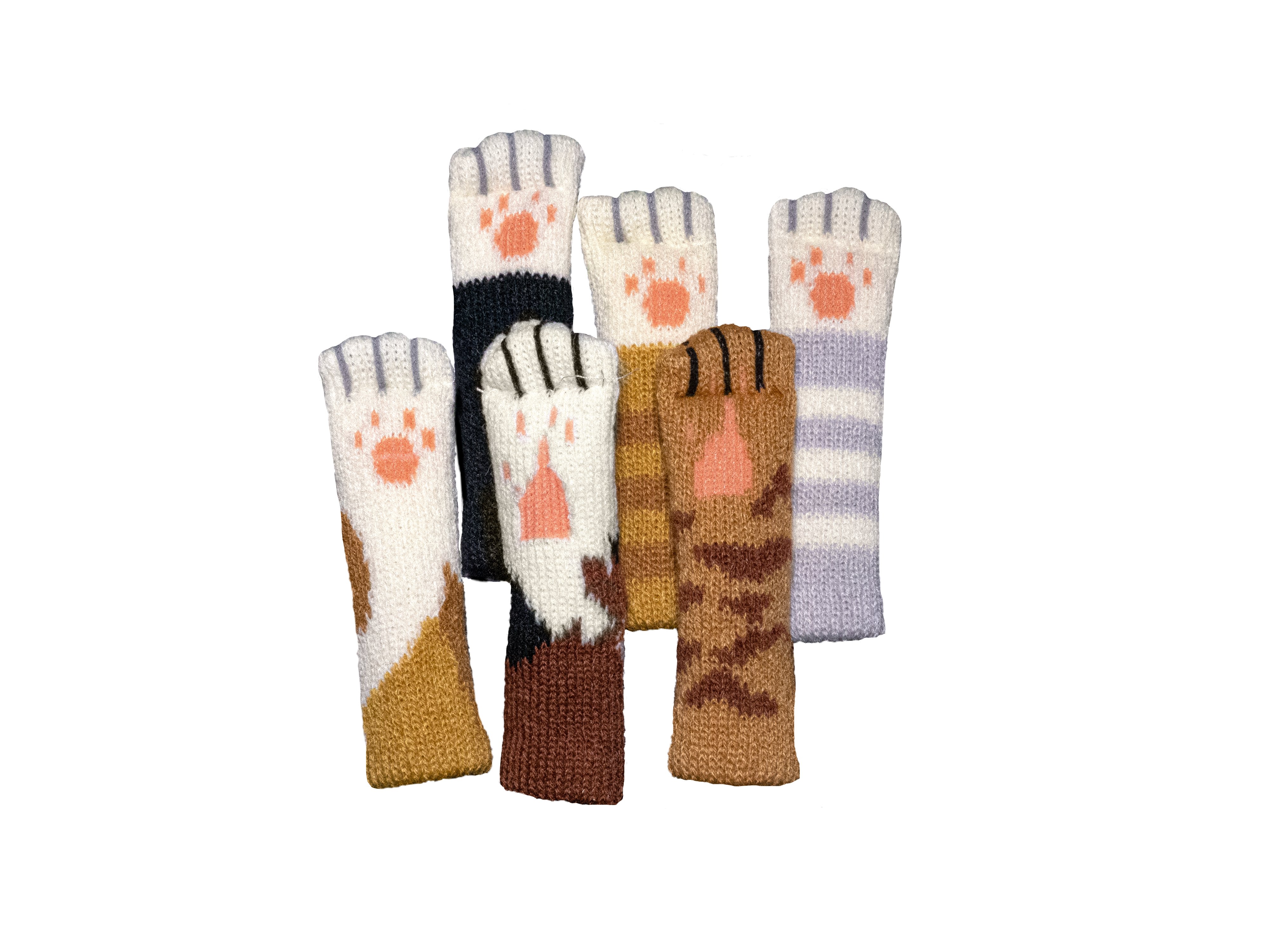 6 pletených návleků na prsty s motivem kočičích tlapek