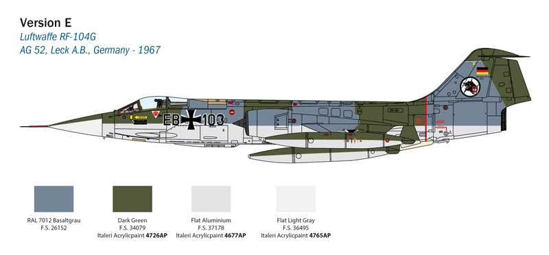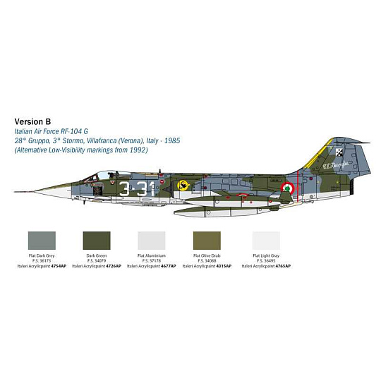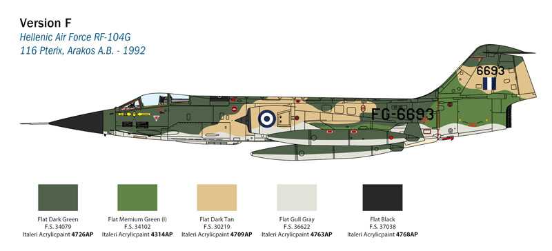 Lockheed F-104 Starfighter je jedním z nejslavnějších stíhacích letounů v dějinách letectví a také jedním ze strojů s nejdelší operační kariérou: ta se začala psát na konci 50. let a v případě některých vzdušných sil skončila až v polovině první dekády po roce 2000. Jeho jedinečný drak se štíhlým trupem a velmi malou plochou křídel z tohoto letounu učinil ideální záchytnou stíhačku. Díky tahu jeho turboreaktivního motoru General Electric J79-GE-11A s přídavným spalováním dokázal překročit rychlost 2,2 Machu a disponoval vynikající stoupavostí. Z toho důvodu naopak nebyl příliš dobře ovladatelný a těžko se pilotoval. Verzi F-104G Starfighter vyrábělo pod licencí hned několik evropských leteckých konstruktérů. Od poloviny 60. let se stala standardním záchytným letounem mnoha států NATO včetně Itálie, Německa, Nizozemska, Řecka a Turecka. Její výzbroj se v podstatě nelišila od předchozích verzí. Hlavní zbraní byl 20mm kanón Vulcan a pod křídla bylo dále možné zavěsit střely typu vzduch-vzduch, bomby i přídavné palivové nádrže pro zvětšení doletu letadla. Postupem času se začal tento stroj používat kromě záchytných úkolů také pro průzkumné mise. Z toho důvodu byl vybaven dedikovaným průzkumným systémem “Orpheus” umístěným ve vnější gondole, který přinášel výborné operační výsledky.