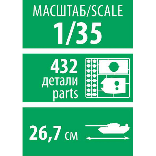 Model tanku ke slepení. Velikost: 1:35; 26,7 cm. Balení obsahuje: 432 dílků ke slepení.