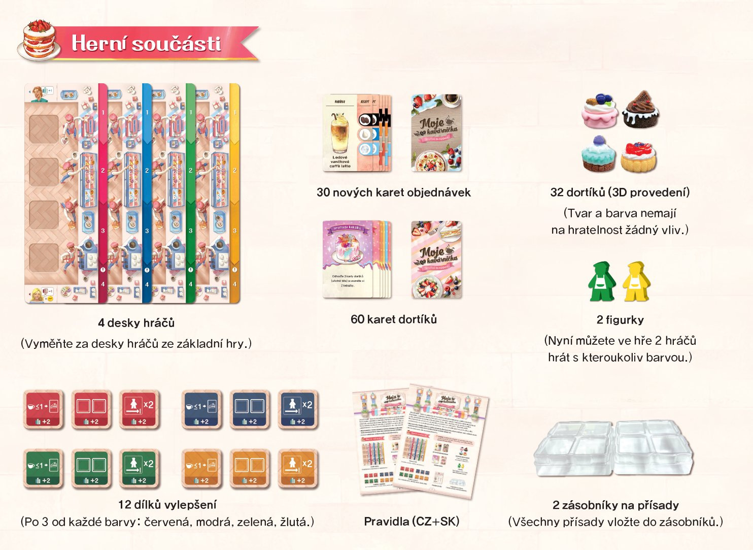 Moje kavárnička – Sladké potěšení je rozšíření základní hry Moje kavárnička. Abyste mohli hrát s tímto rozšířením, musíte kombinovat herní součásti tohoto rozšíření s herními součástmi základní hry.