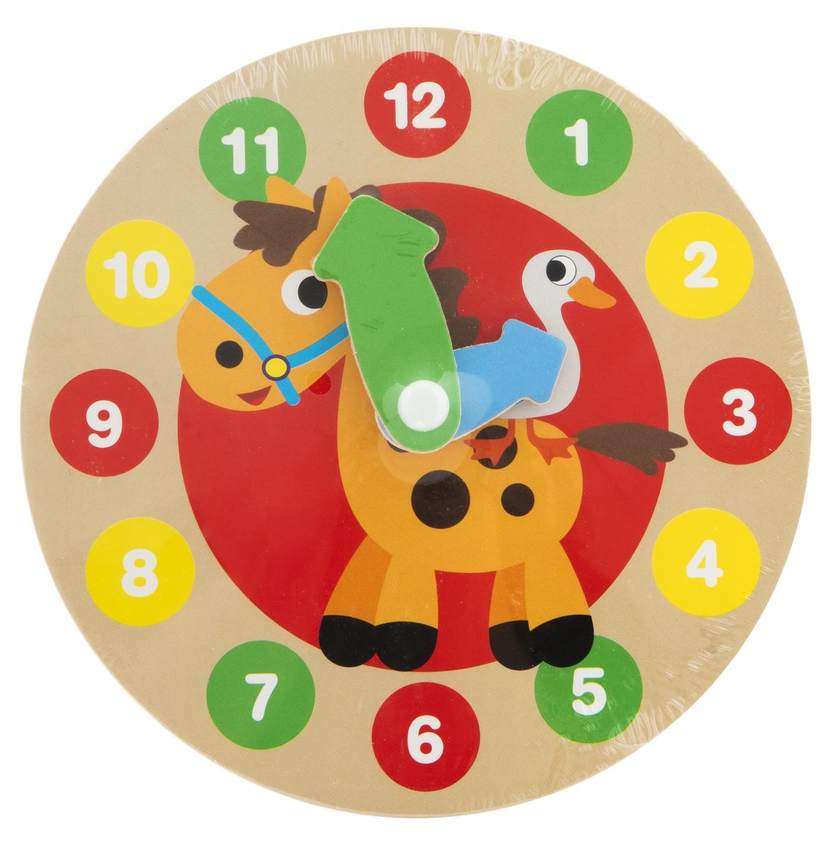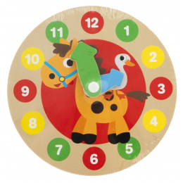 Nádherné dřevěné dětské hodiny o průměru 14 cm, s touto šikovnou pomůckou se děti naučí poznávat čas na ručičkových hodnikách lusknutím prstu, barevně označené číslice i ručičky, uprostřed ciferníku je krásný obrázek koníka s kačerem