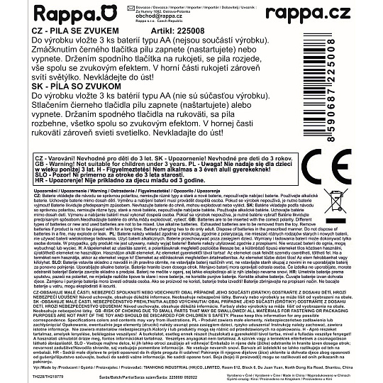 Tato motorová pila zajisté potěší všechny kluky, a to nejen z toho důvodu, že působí jako opravdová. Po zmáčknutí tlačítka vydává zvuk, rozsvítí se světýlko a řetěz se začne točit jako u skutečné pily. Funguje na 3x1.5V AA baterie, které nejsou součástí balení. Délka výrobku je cca 40 cm.