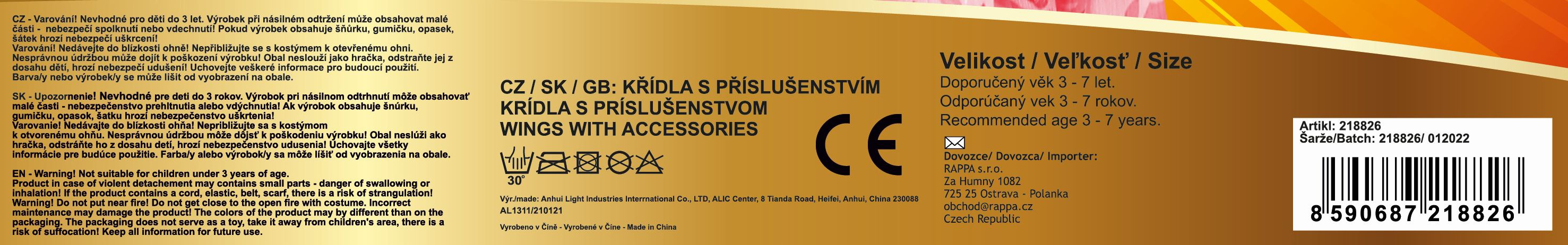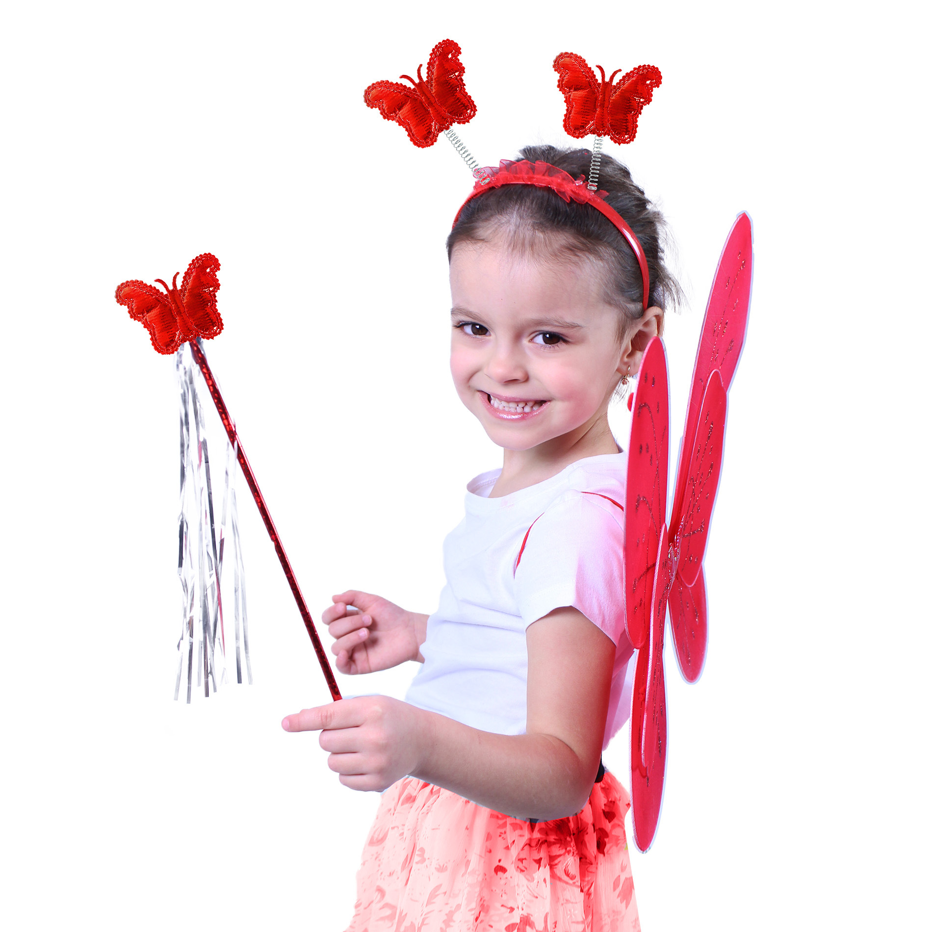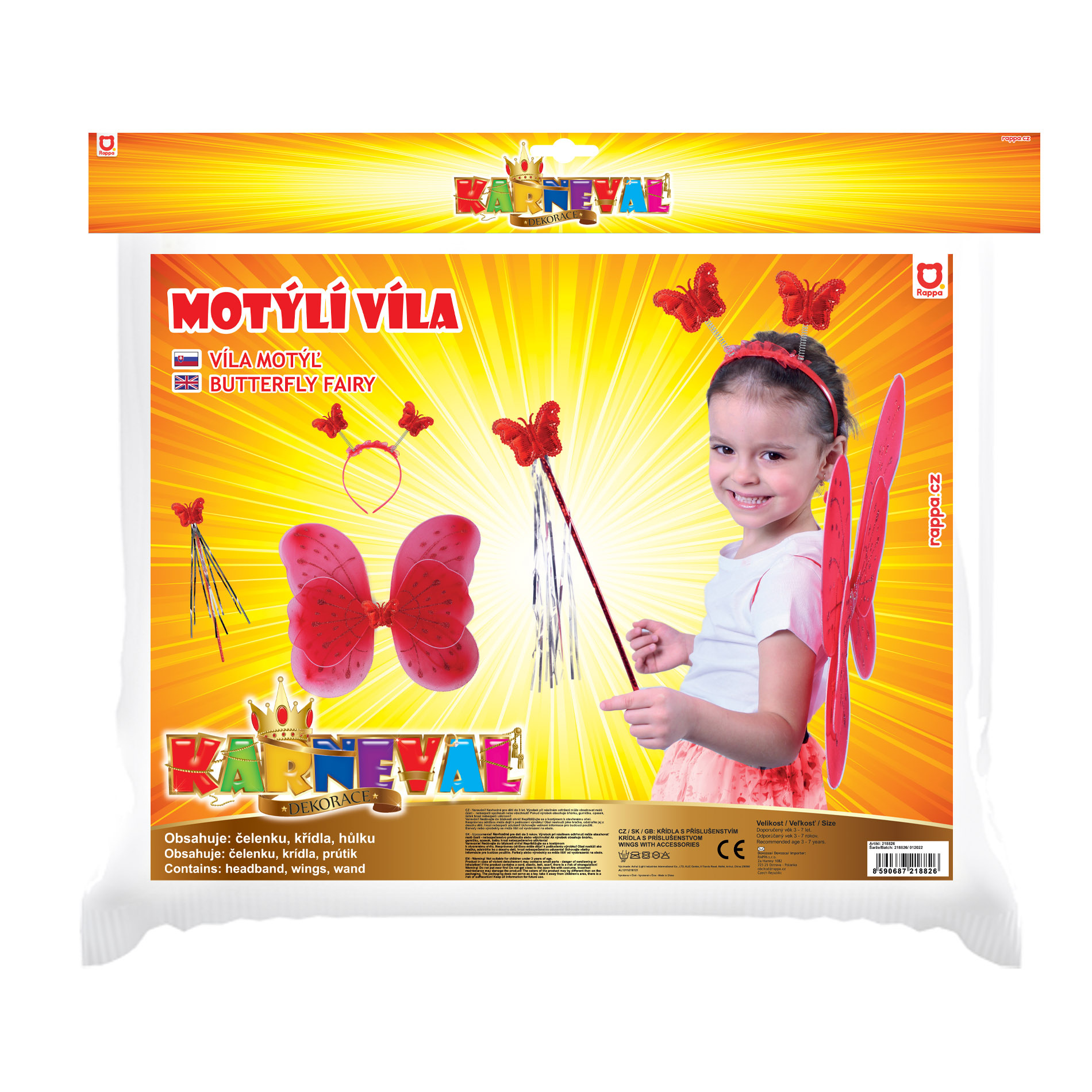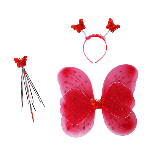 Roztomilá červená motýlí křidélka na gumičku jsou určena pro holčičky ve věkovém rozmezí 3-10 let (104-150 cm). Součástí této karnevalové sady je také čelenka s motýlky na pružinkách a hůlka.