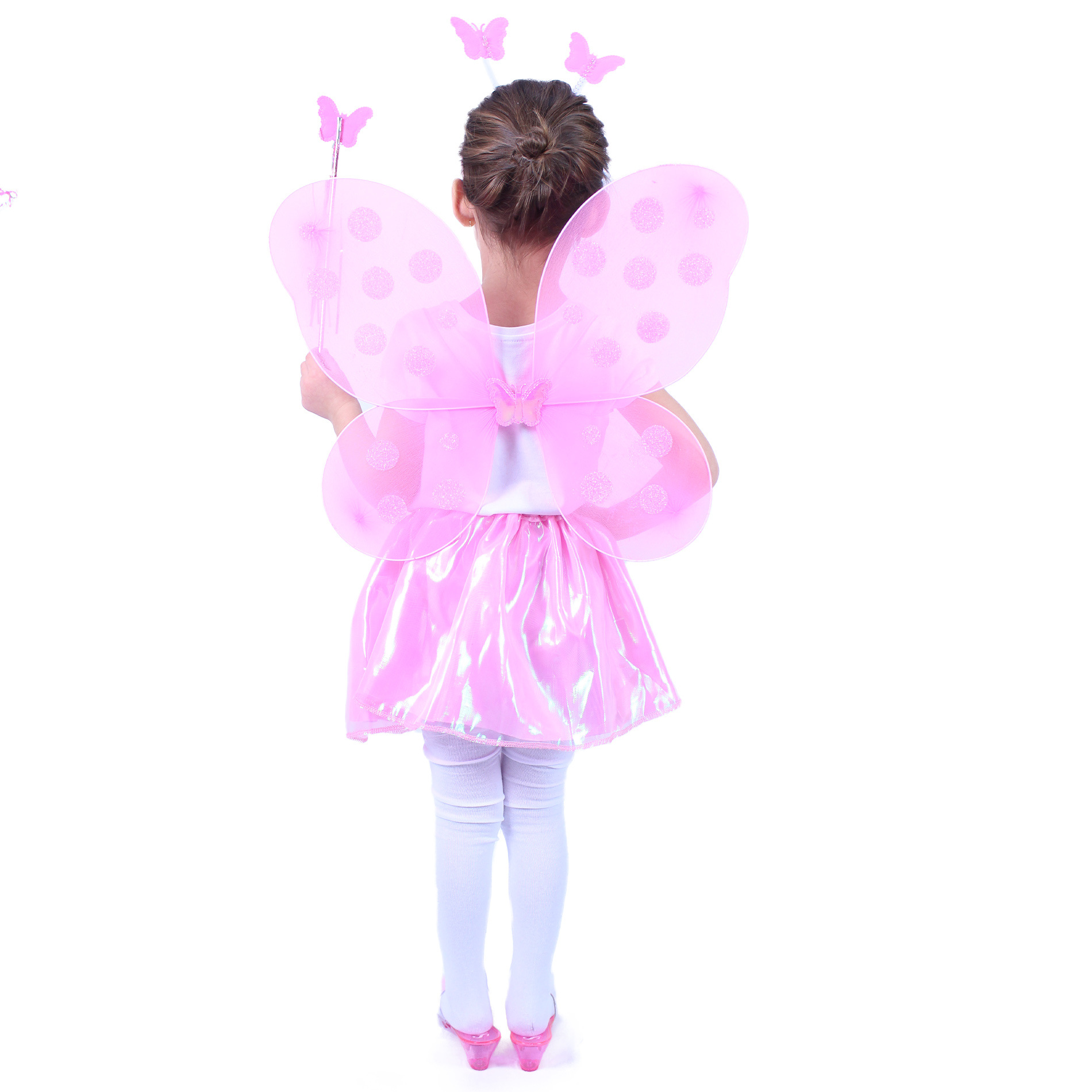 Roztomilá růžová motýlí křidélka na gumičku jsou určena pro holčičky ve věkovém rozmezí 3-10 let (104-150 cm). Součástí této karnevalové sady je také čelenka s motýlky na pružinkách a hůlka.