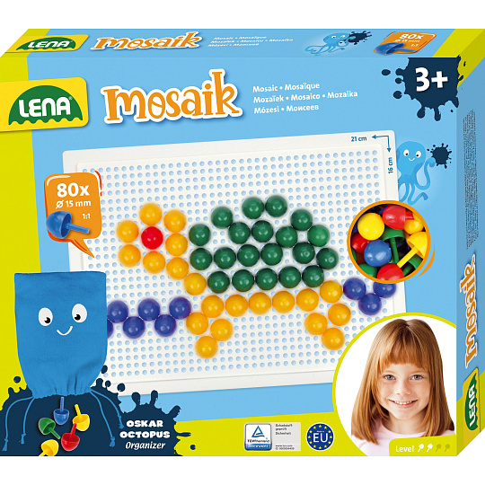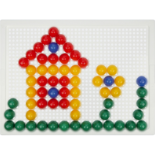 Skládejte barevné kloboučky na podkladovou desku. balení obsahuje 80 ks kloboučků a pytlíček na uložení. Předlohu najdete na zadní straně krabice. Průměr hlavičky kloboučku: 1,5 cm Rozměr podkladové desky: 21 x 16 cm Rozměr krabice: 24 x 21 x 3,5 cm Vhodné pro děti od 3 let