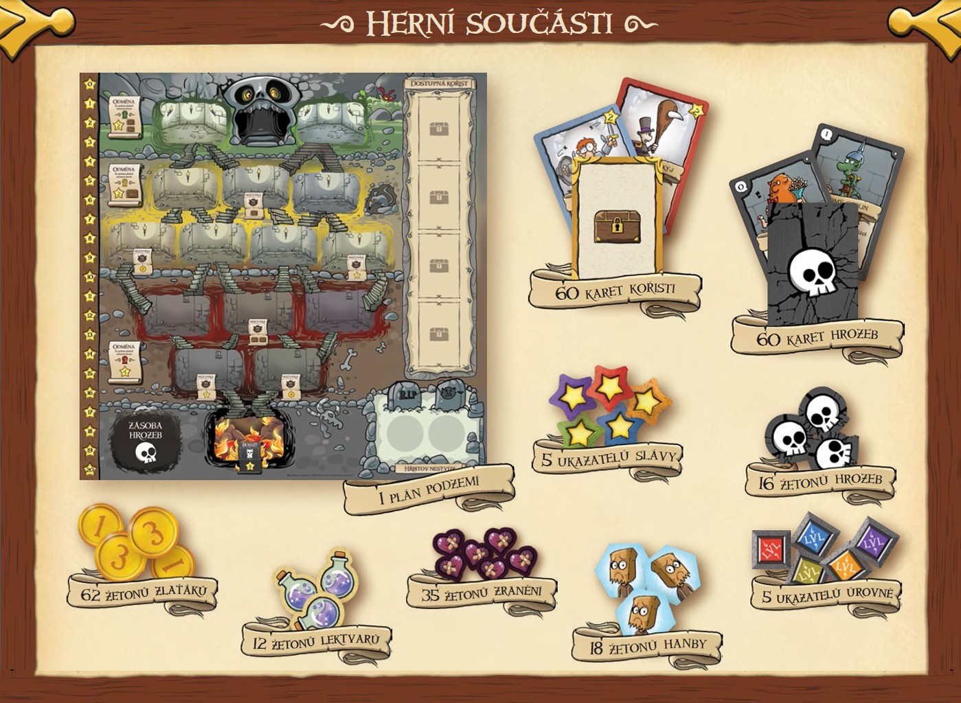 Obsah balení: 60 karet kořisti, 60 karet hrozeb, 62 žetonů zlaťáků, 35 žetonů zranění,