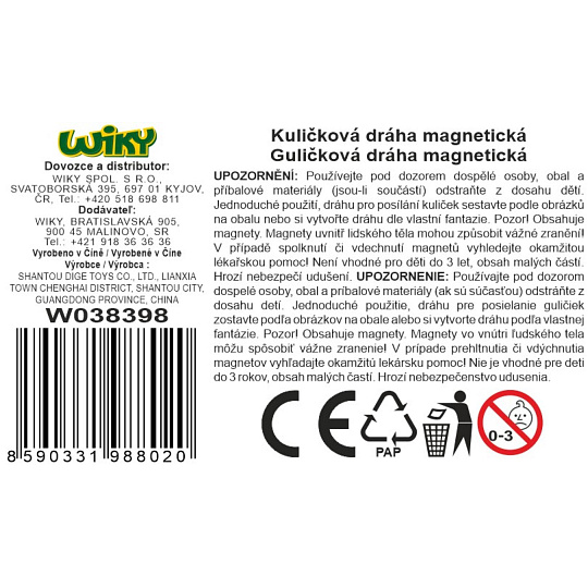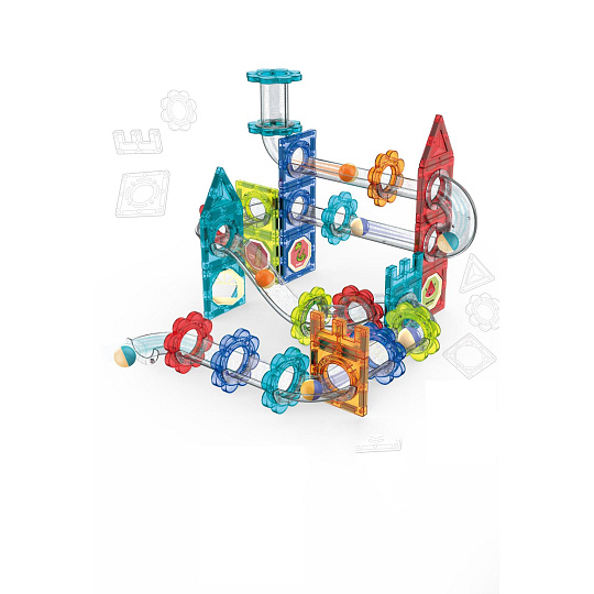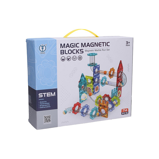 Kuličková dráha magnetická set. Balení obsahuje 74 ks. Obsahuje magnetickou stavebnici s tunely na tvorbu kuličkové dráhy, nálepky, návod, kuličky.