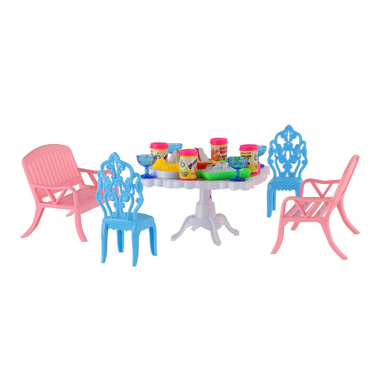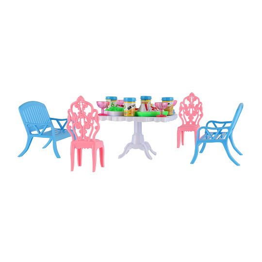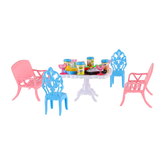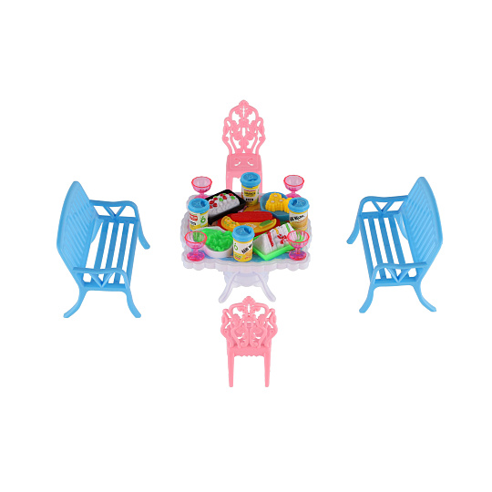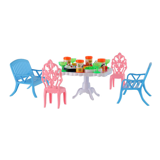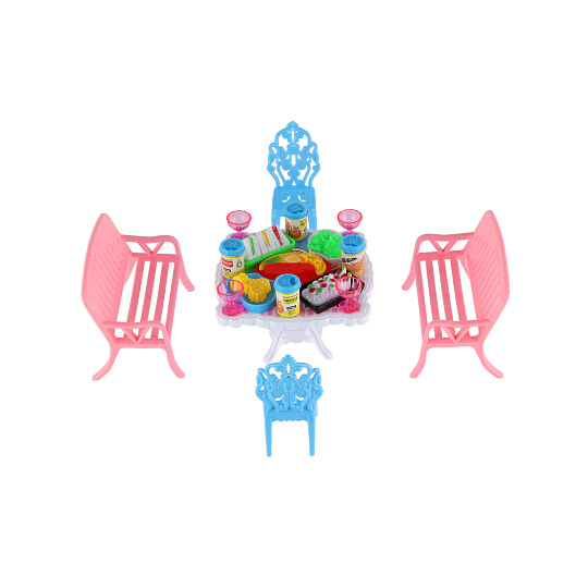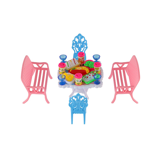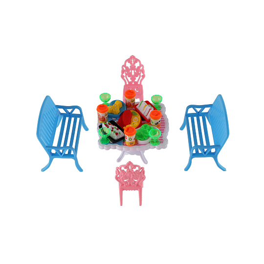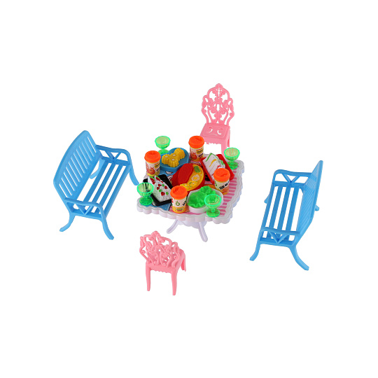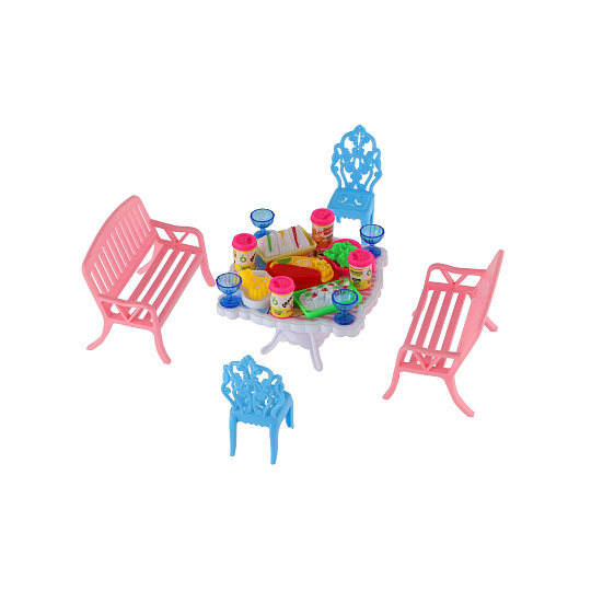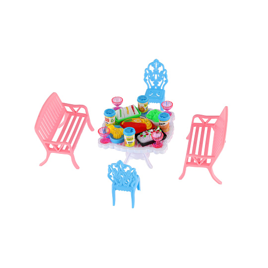 Potřebujete Vašim panenkám zpříjemnit sezení před domečkem? V tom případě je tato sada přesně pro Vás. Dvě lavičky, dvě židličky, stůl a doplňky v podobně pohoštění na stůl bude jistě oblíbenou část obydlí pro panenky. Rozměr balení: 14 x 11 x 16 cm Vhodné pro děti od 3 let